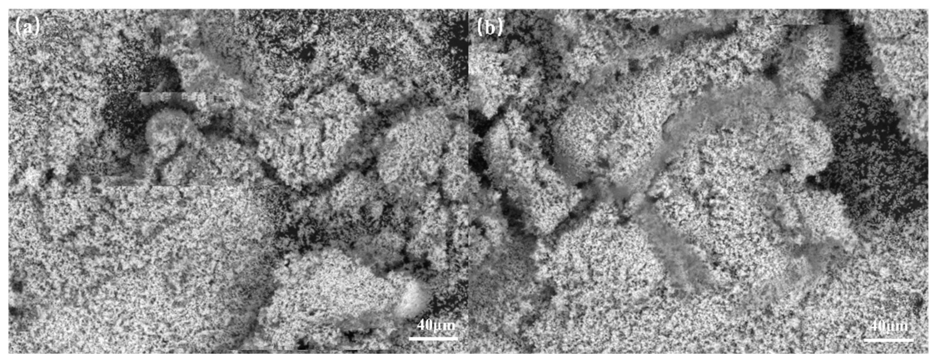 Figure 5a,b, it can be seen that there is only a small amount of sintering phenomenon before and after thermal aging, and the grains grow uniformly without agglomeration. The surface still retains fine grains and has a large surface area. The presence of a small amount of sintering phenomenon may be due to the uneven distribution of Mg, which leads to sintering in this area. This also indicates that Mg doping can indeed refine the grain size and prevent grain growth and sintering.