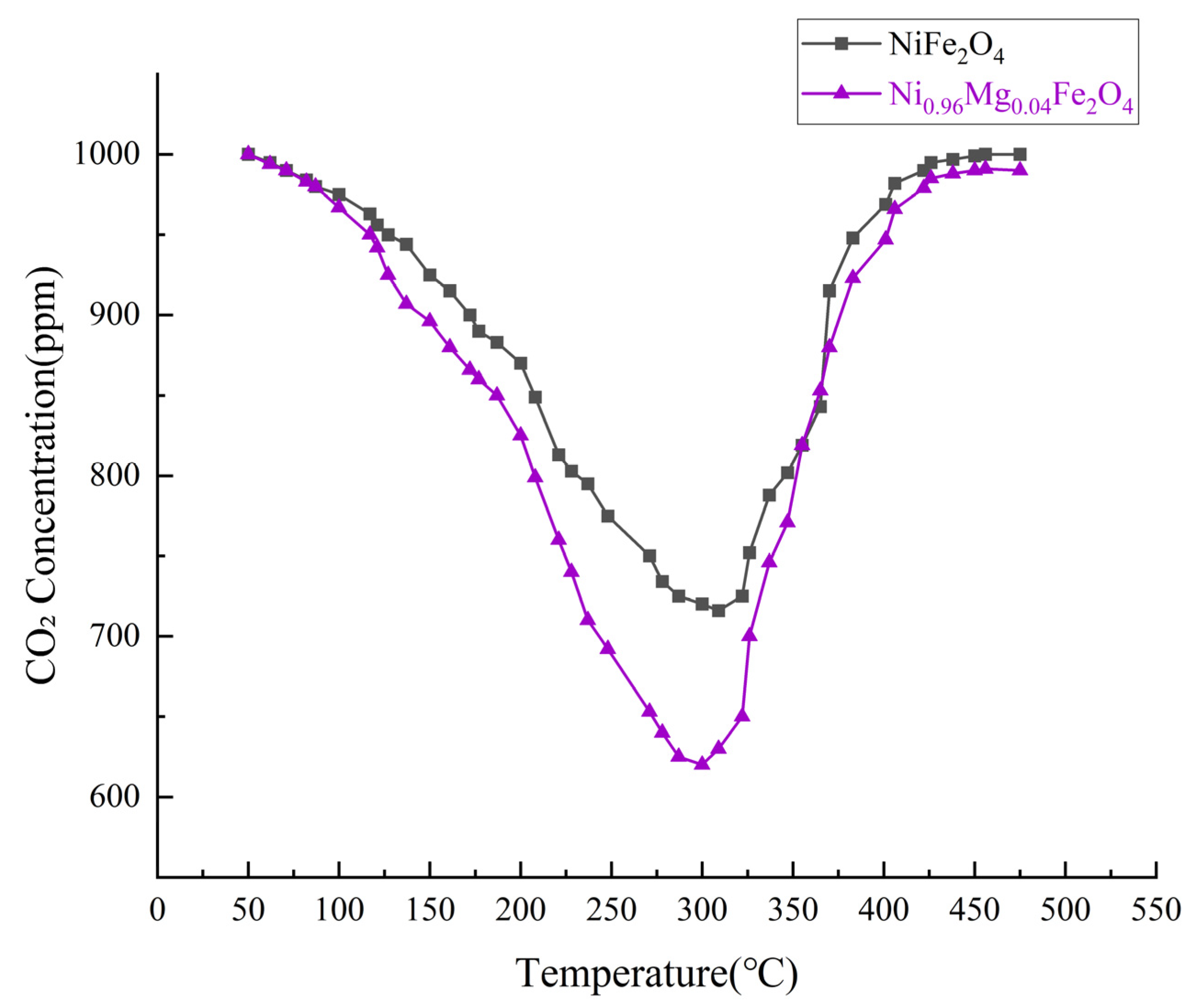 During the high-temperature stage, the catalyst is activated and begins to chemically adsorb CO2. The adsorption curve of Ni0.96Mg0.04Fe2O4 is lower than that of NiFe2O4, indicating a faster CO2 adsorption rate and an increase in CO2 adsorption at each temperature point. At the same time, the adsorption peak significantly shifted downwards, and the CO2 adsorption rate reached 38.1% at the highest peak. The adsorption strength and amount of CO2 by Mg-doped NiFe2O4 were significantly improved.