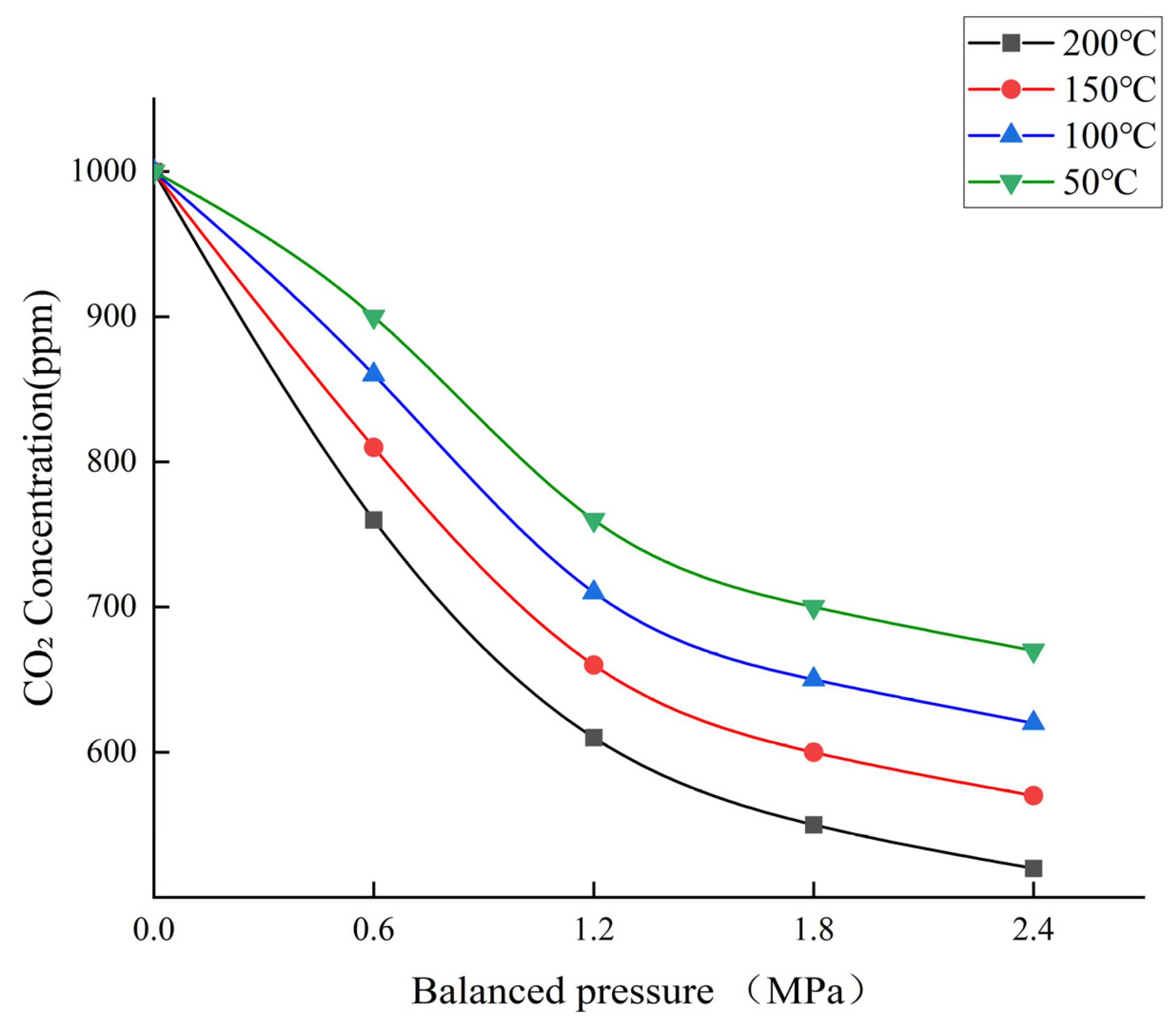 2 concentration decreases in the four different temperatures. This indicates that the activation performance of the catalyst improves with increasing temperature and balanced pressure.
