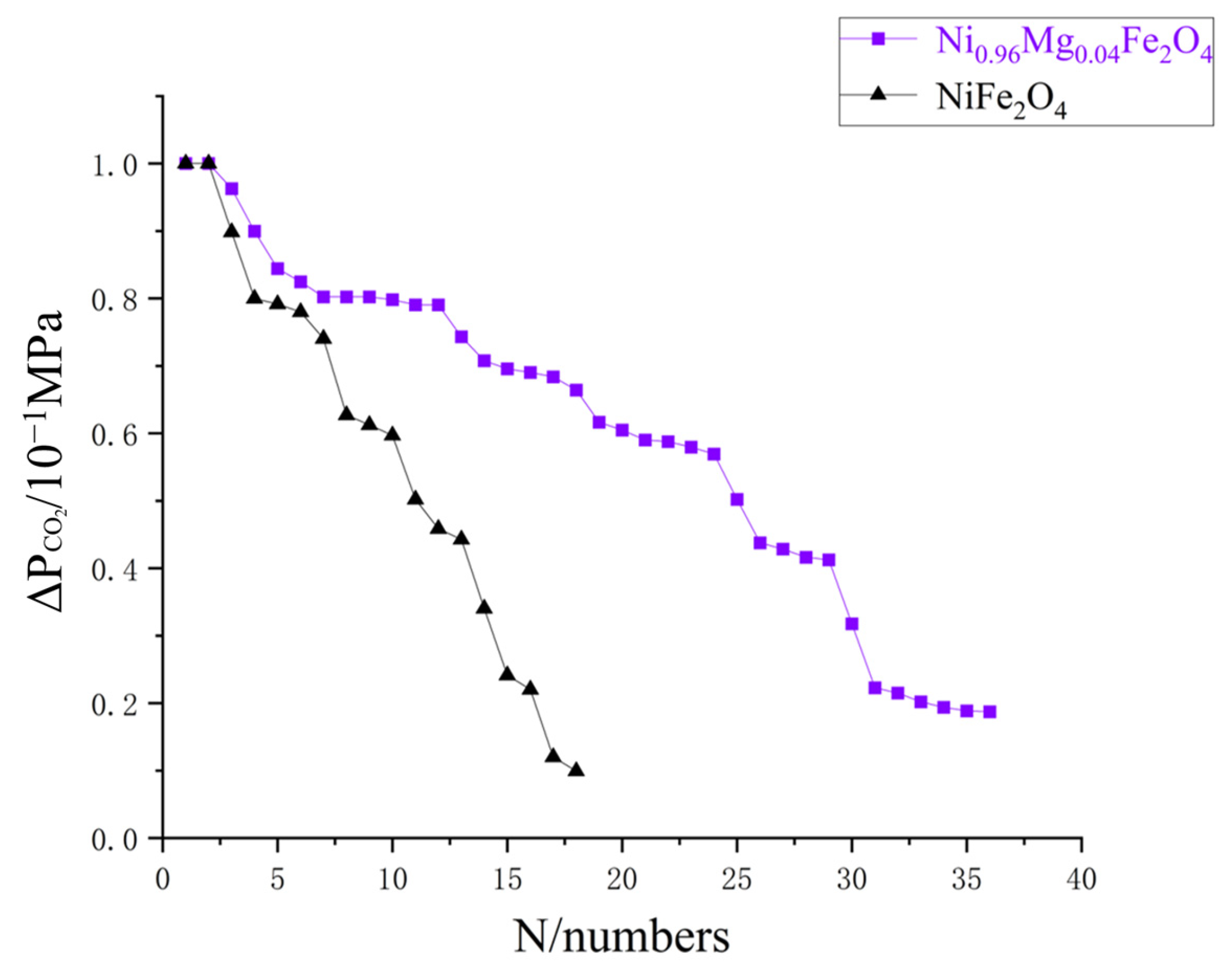 For Ni0.96Mg0.04Fe2O4, as the number of cycles increases, the CO2 pressure change also shows a step-like decrease, but the rate of decrease in CO2 conversion is much slower than that of NiFe2O4, which means its activity decreases slower and can withstand more cycles of reaction.