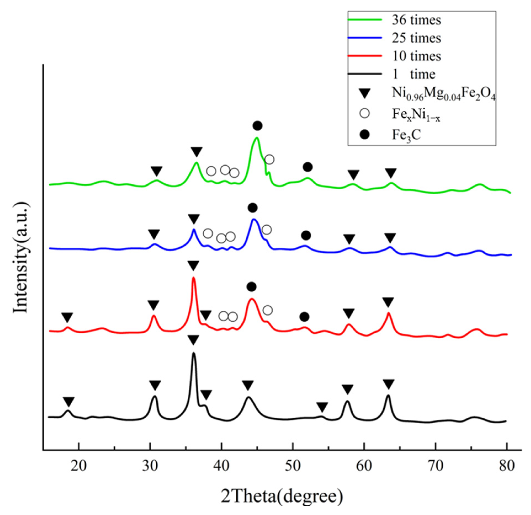 In the first three cycles of the reaction, high reaction activity is observed, with almost all of CO2 converted to C. After five cycles, the conversion rate of CO2 decreases to around 82%. As the number of cyclic reactions continues to increase, the catalytic activity maintains a relatively long stability. When the number of cyclic reactions reaches 12, the CO2 conversion rate remains at around 80%, while the CO2 conversion rate of NiFe2O4 is only about 46%. After 29 cycles of reaction, the CO2 conversion rate is around 41%, and the catalytic activity quickly decreased thereafter. After 36 cycles of reaction, the CO2 conversion rate is only about 20%, indicating low decomposition activity. From this, it can be seen that Mg doping in NiFe2O4 improves its stability, significantly slowing down the rate of decomposition activity reduction after cyclic reactions, greatly increasing its cycle reaction frequency and service life.