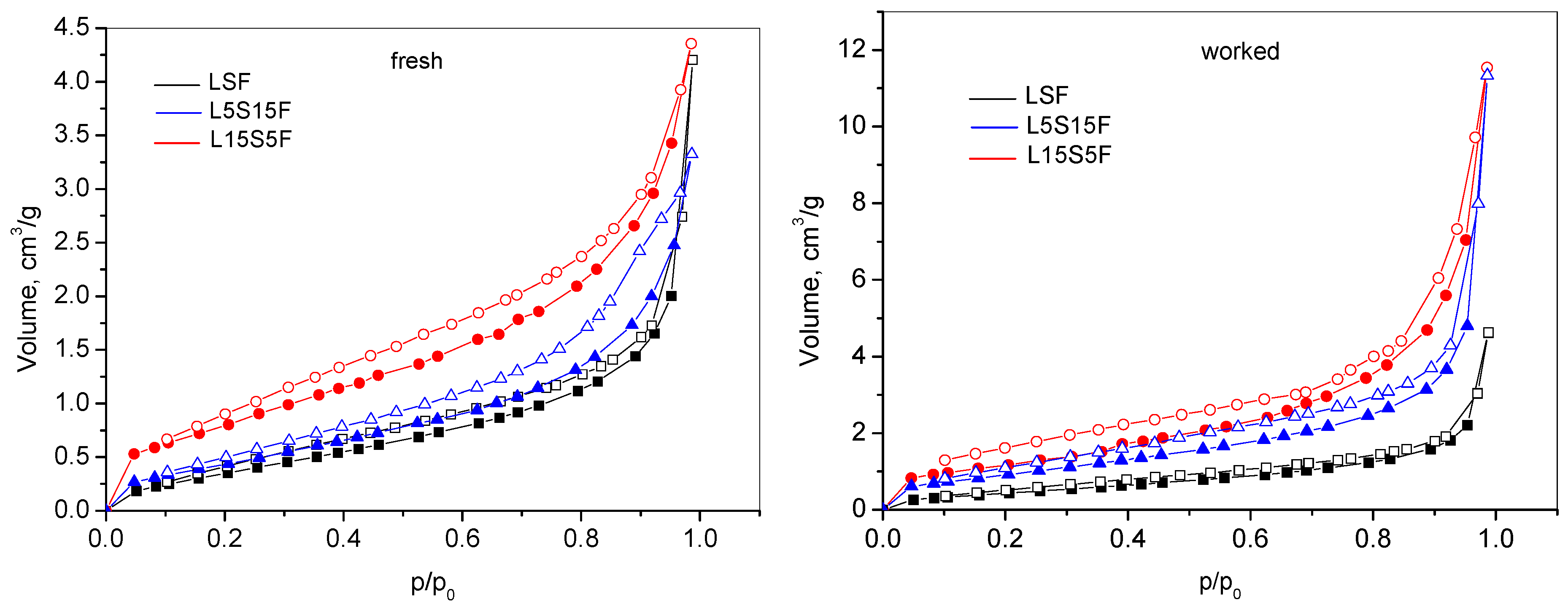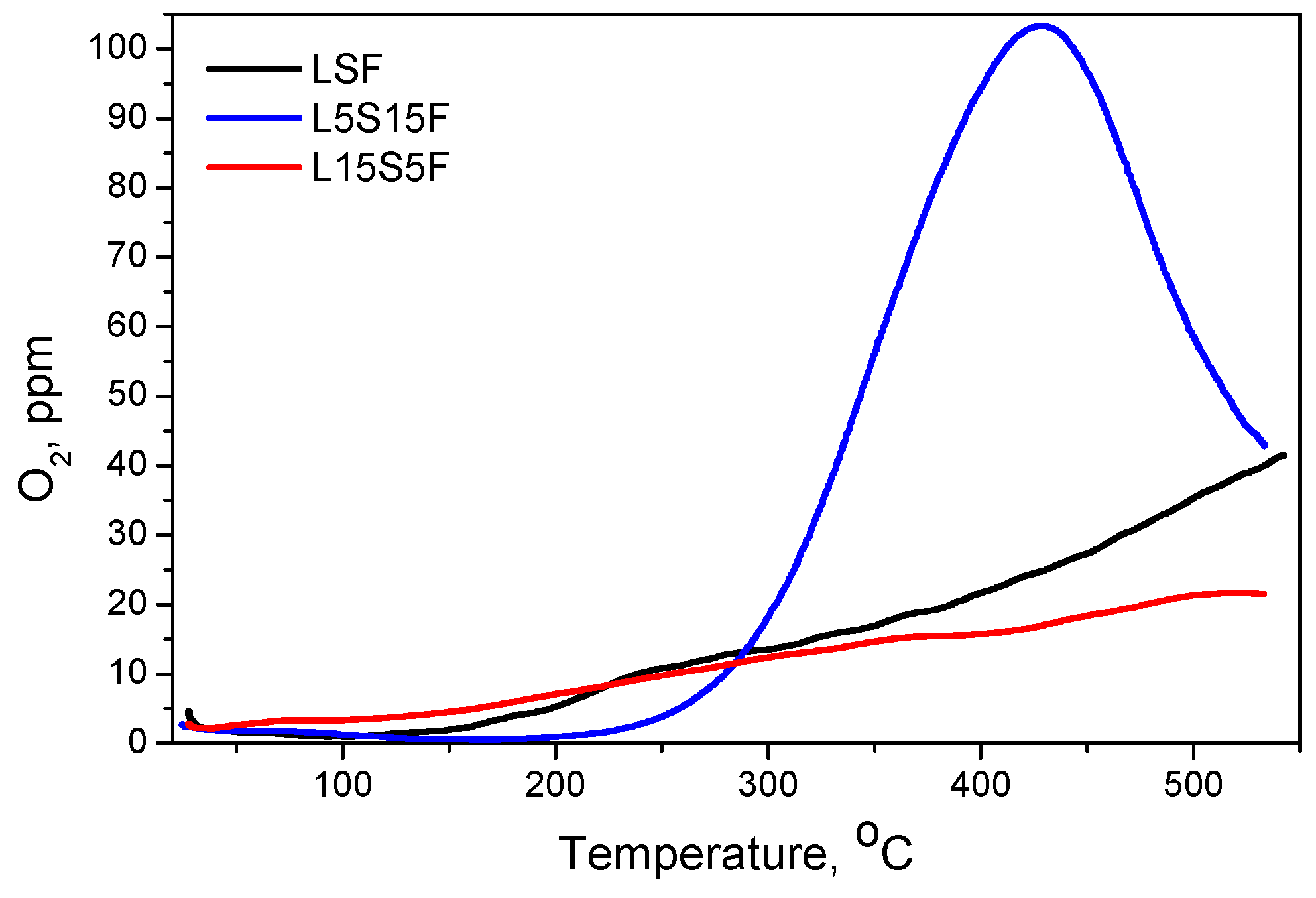 2-TPD of L15S5F shows broad peaks at ~310 °C and ~503 °C. Similar to this is the curve for LSF, showing oxygen desorption above 150 °C with a broad peak at ~283 °C and continuous evolution as the temperature approaches 550 °C. Remarkably different is the case for L5S15F, where a well-defined peak in the range 200–550 °C, centered at 430 °C, is observed. The estimated amounts of desorbed oxygen are calculated as follows: L15S5F—51 μmol/g
