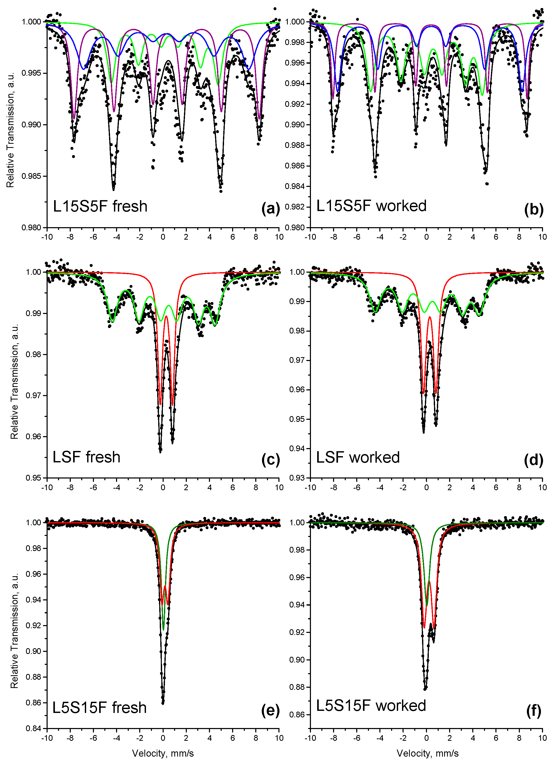The Mössbauer spectra were obtained with a WissEl (Wissenschaftliche Elektronik GmbH, Starnberg, Germany) electromechanical spectrometer working in a constant acceleration mode. A 57Co/Rh (activity ≅ 50 mCi) source and α-Fe standard were used. The experimentally obtained spectra were fitted using WinNormos-for-Igor (Version 6.0) software. The parameters of hyperfine interaction, including isomer shift (δ), quadrupole splitting (Δ), quadrupole shift (2ε), effective internal magnetic field (Bhf), line widths (Γexp), and relative weight (G) of the partial components in the spectra, were determined.