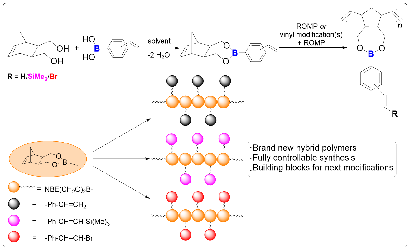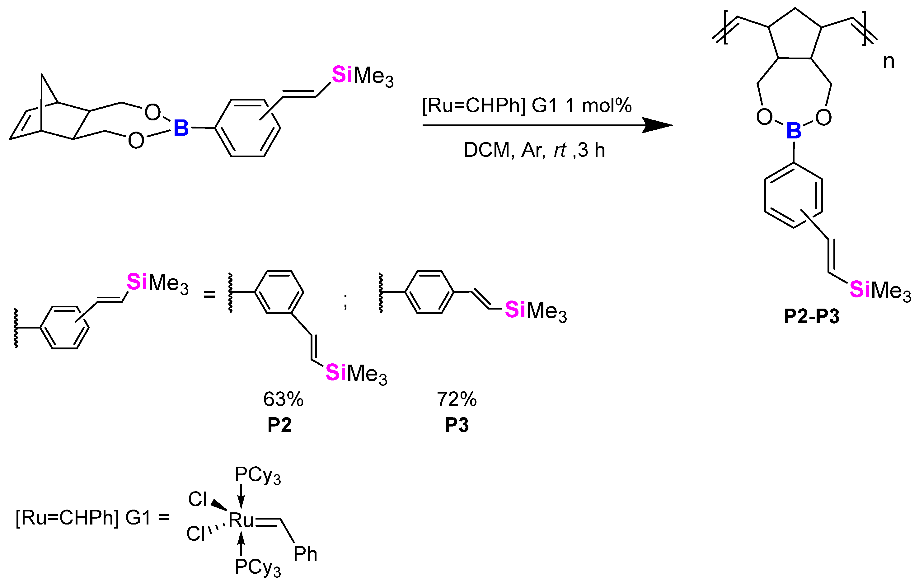 - Garbarek, J.; Majchrzak, M.; Wałęsa-Chorab, M.; Kubicki, M. Synthesis and Electrochemical Properties of Well-defined Norbornene-B-Ferrocene-dioxaborolane Hybrid Polymeric Material. Inorg. Chem. 2025, 64, 21368–21378. [Google Scholar] [CrossRef]