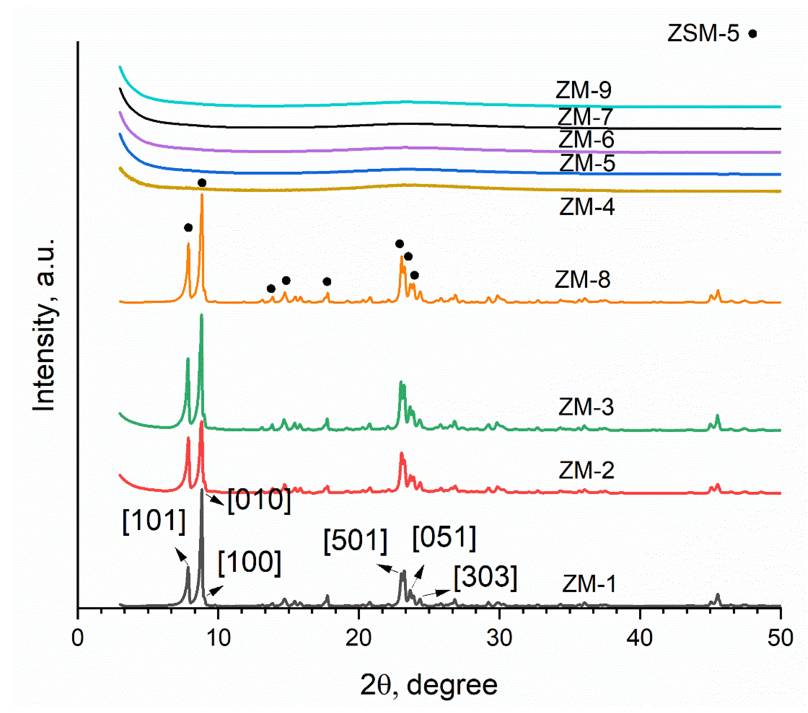 - Yu, J.; Du, K.; Pan, D.; Li, H.; Ding, L.; Chen, W.; Zhang, Y.; Tang, Y. Distinguishing and unraveling classical and non-classical pathways in MFI zeolite crystallization: Insights into their contributions and impact on the final product. Inorg. Chem. Front. 2025, 12, 4048–4058. [Google Scholar] [CrossRef]