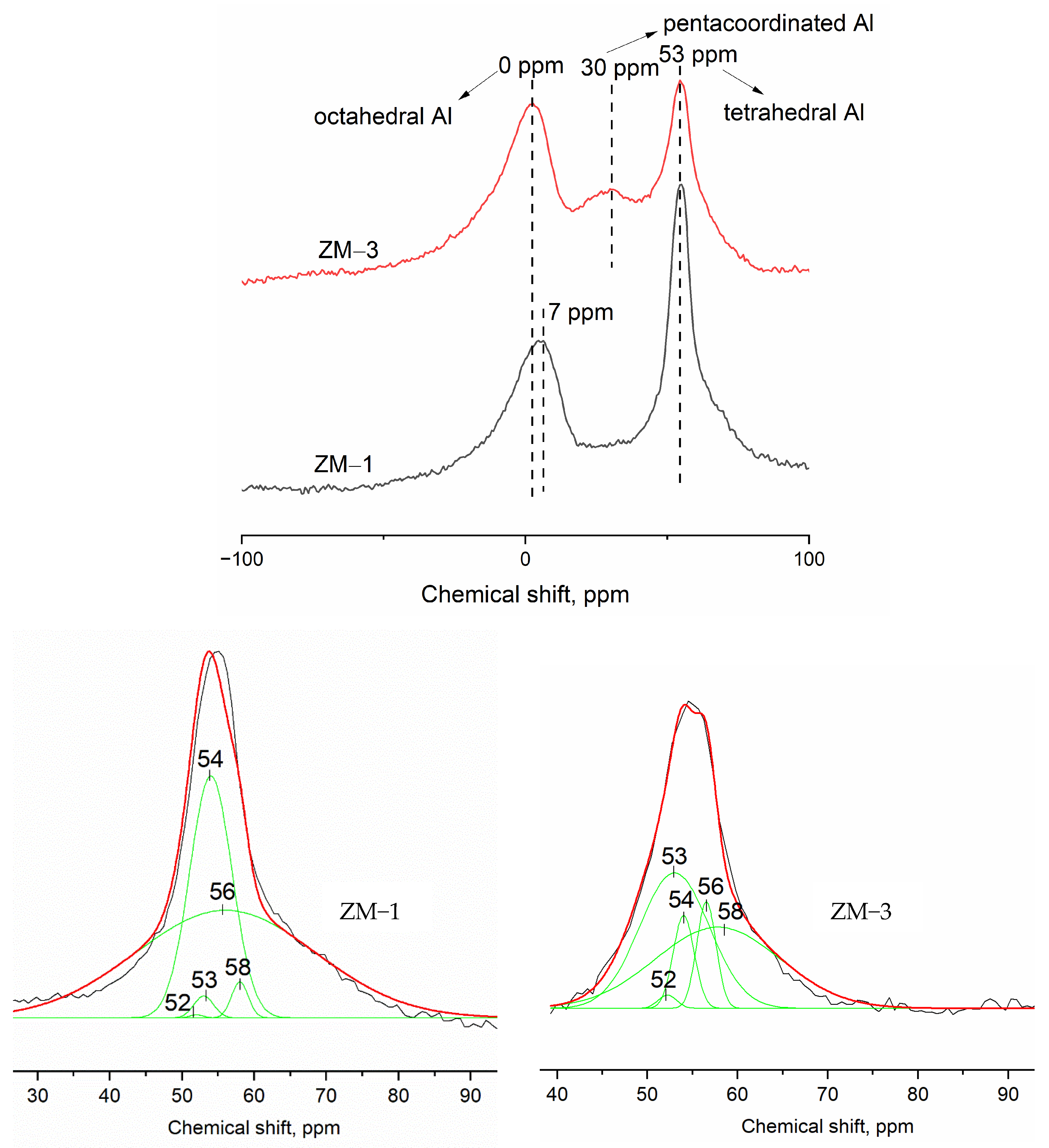 | Catalyst | Chemical Shift (ppm) Assignment of Al Sites and Relative Peak Areas, % | 56 + 54, % | 54/56 | (Si/Al)framework * | ||||