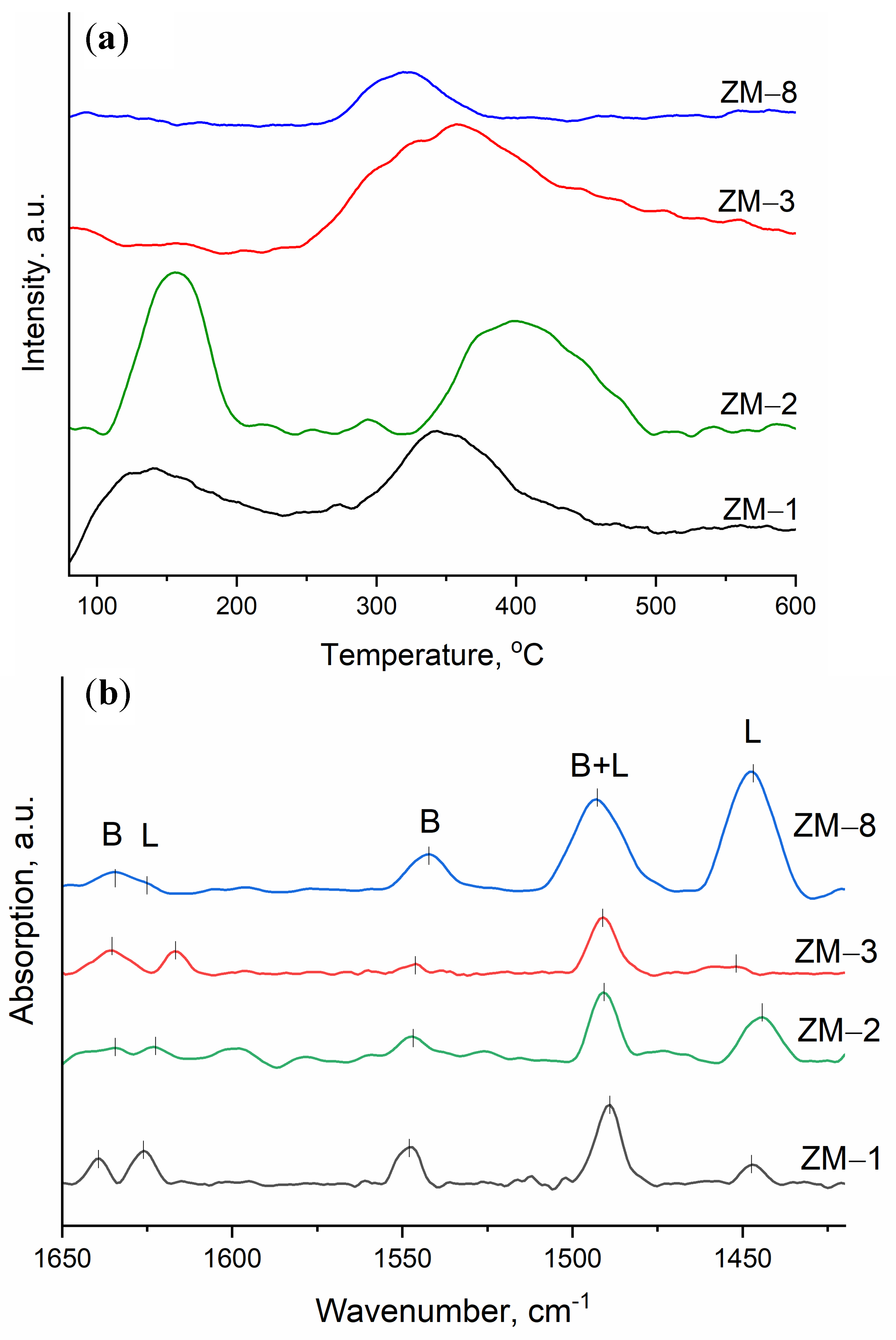 | Catalyst | Acidity, μmol NH3 g−1 | Peak Temperature, °C | Py-FTIR | |||||