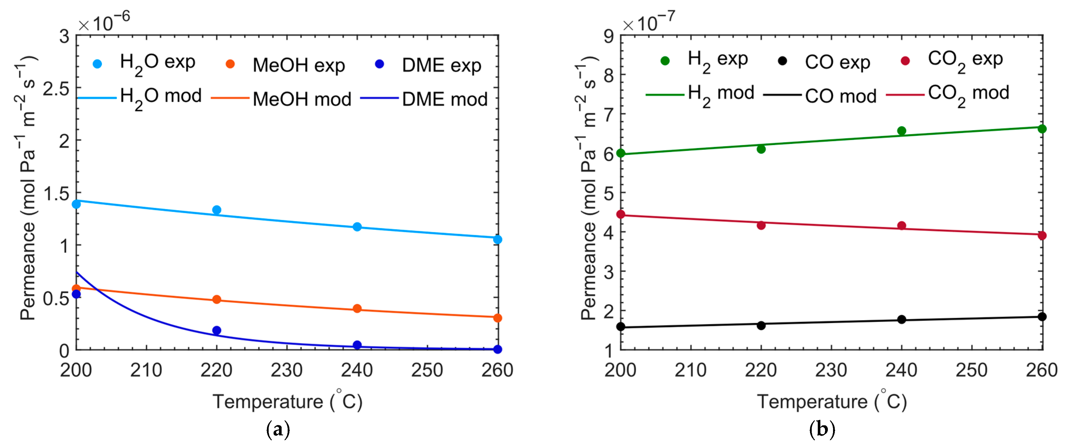 - Poto, S.; Endepoel, J.G.H.; Llosa-Tanco, M.A.; Pacheco-Tanaka, D.A.; Gallucci, F.; Neira d’Angelo, M.F. Vapor/gas separation through carbon molecular sieve membranes: Experimental and theoretical investigation. Int. J. Hydrogen Energy 2022, 47, 11385–11401. [Google Scholar] [CrossRef]