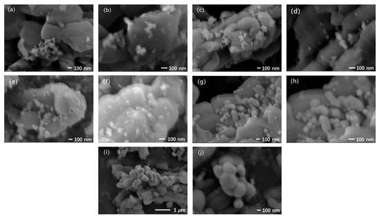 SEM images of 20% BiVO4@SiO2 composites with different calcination temperatures: 400 °C (a,b); 450 °C (c,d); 500 °C (e,f); 550 °C (g,h); 600 °C (i,j).
