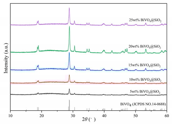 XRD spectra of BiVO4@SiO2 composites with different BiVO4 loading amounts.