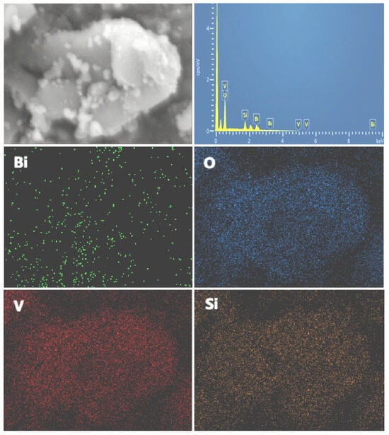 Further EDS analysis of 20 wt% BiVO4@SiO2 revealed an even distribution of Bi, V, Si, and O elements in the composite. As can be observed in Figure 5, the elements of Si and V were abundant and evenly distributed throughout the composite, while the even presence of the Bi element indicated that the nanoparticles of BiVO4 were uniformly dispersed on SiO2, confirming that BiVO4 nanostructured composites were successfully constructed.