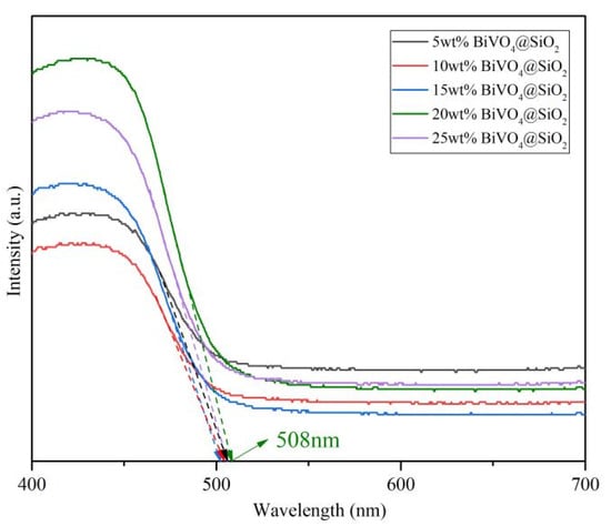 To investigate the optical properties of the as-prepared composites, UV-vis diffuse reflectance spectra were recorded for all the different loading BiVO4@SiO2 samples. As shown in Figure 6, all the composites exhibited intense absorption in the range of 400 nm to 600 nm, suggesting their good potential for light absorption in photocatalysis. Moreover, absorption was intensified in the order of 10 wt%, 5 wt%, 15 wt%, 25 wt%, 20 wt% BiVO4 loading amounts for these composites, suggesting the superior light-utilization capacity of 20 wt% BiVO4@SiO2. The 20 wt% BiVO4@SiO2 exhibited the most visible absorption boundary, compared to other BiVO4@SiO2 composites, suggesting its superior light-utilization capacity for photocatalysis.