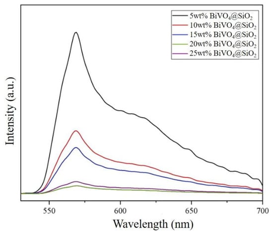 To shed light on the potential of these composites with regard to photocatalytic performance, fluorescence spectroscopy was carried out for all the composites. Figure 7 shows the fluorescence spectra of all the BiVO4@SiO2 composites. With an excitation wavelength of 360 nm, an emission peak appearing at 570 nm can be observed for all the composites. With increases in the loading percentage of BiVO4 from 5% to 10%, 15%, and finally, 20%, the fluorescence intensity of the corresponding catalysts gradually decreased. However, the fluorescence intensity exhibited a dramatic rise when the loading percentage of BiVO4 was further increased, to 25%. This in turn resulted in the lowest fluorescence intensity for the 20 wt% BiVO4@SiO2 composites, indicating its superior photoinduced charge-separation efficiency and excellent photocatalytic performance potential, compared to its counterparts.
