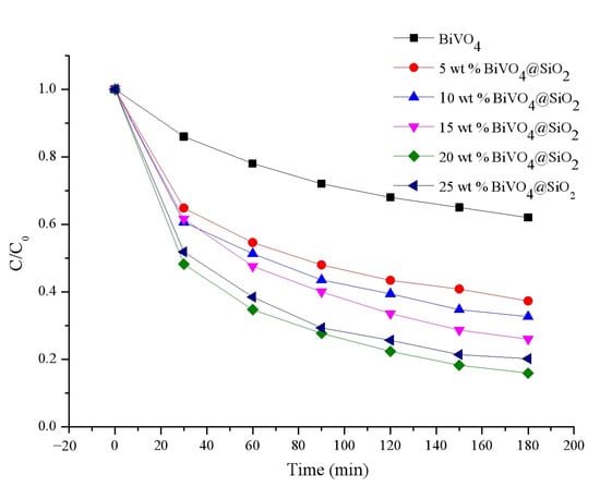 Further, the photocatalytic degradation performance of various bismuth-based catalysts toward TC was compared. The results are presented in Table 1, and show the promising degradation potential of these newly-fabricated small-sized BiVO4@SiO2 composites. As can be seen from Table 1, 20 wt% BiVO4@SiO2 exhibited excellent photocatalytic degradation of TC, with superior efficiency of 84.1% in 180 min, compared to pure bismuth vanadate without heterojunction or other decorated structures [22,23,24,25]. This demonstrates the effectiveness of the small-sized construction strategy in enhancing photocatalytic performance.