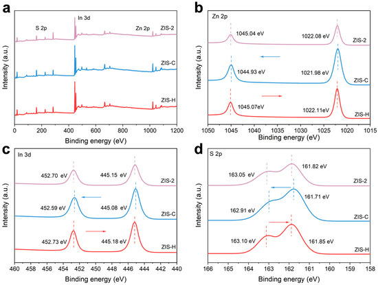 To determine the elemental composition and surface chemical states of the heterojunction, X-ray photoelectron spectroscopy (XPS) measurements were performed. The XPS survey spectrum presented in Figure 3a confirmed the presence of Zn, In and S in the sample. In Figure 3b, the characteristic double peaks of ZIS-H at 1045.07 eV and 1022.11 eV were assigned to Zn 2p1/2 and Zn 2p3/2, respectively. As shown in the high-resolution XPS spectrum of Figure 3c, the peaks at 452.73 eV and 445.18 eV were attribu ted to In 3d3/2 and In 3d5/2, respectively. In contrast, the peaks at 163.10 eV and 161.85 eV corresponded to S 2p1/2 and S 2p3/2, respectively (Figure 3d). Compared with ZIS-H and ZIS-C, the characteristic peaks of Zn 2p, In 3d, and S 2p for ZIS-2 shifted toward lower and higher binding energies, respectively. Since binding energy reflects the electron density, these shifts indicated that the electron concentration of ZIS-2 increased and decreased relative to that of ZIS-H and ZIS-C, respectively. Therefore, the variations in binding energy were attributed to the directional electron transfer from ZIS-H to ZIS-C, which was induced by the formation of the hexagonal/cubic heterojunction.