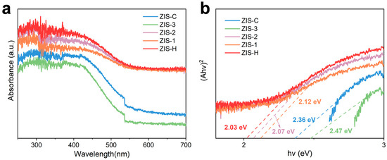 (a) UV–Vis spectra of ZIS-H, ZIS-C and ZIS composites. (b) Band gap of ZIS-H, ZIS-C and ZIS composites by Tauc plot.