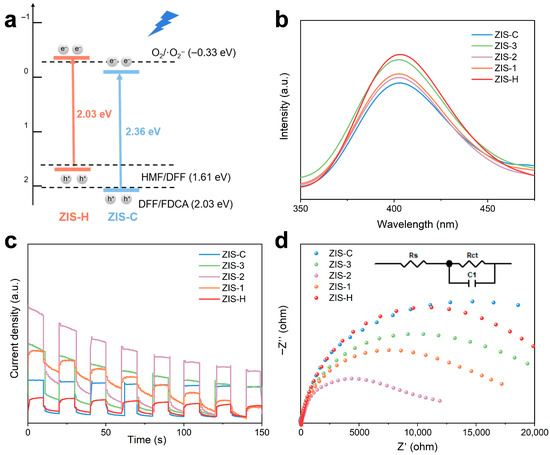 (a) Band structures of ZIS-2. (b) PL spectra, (c) Transient photocurrent responses, and (d) EIS spectra of ZIS-H, ZIS-C and ZIS composites.