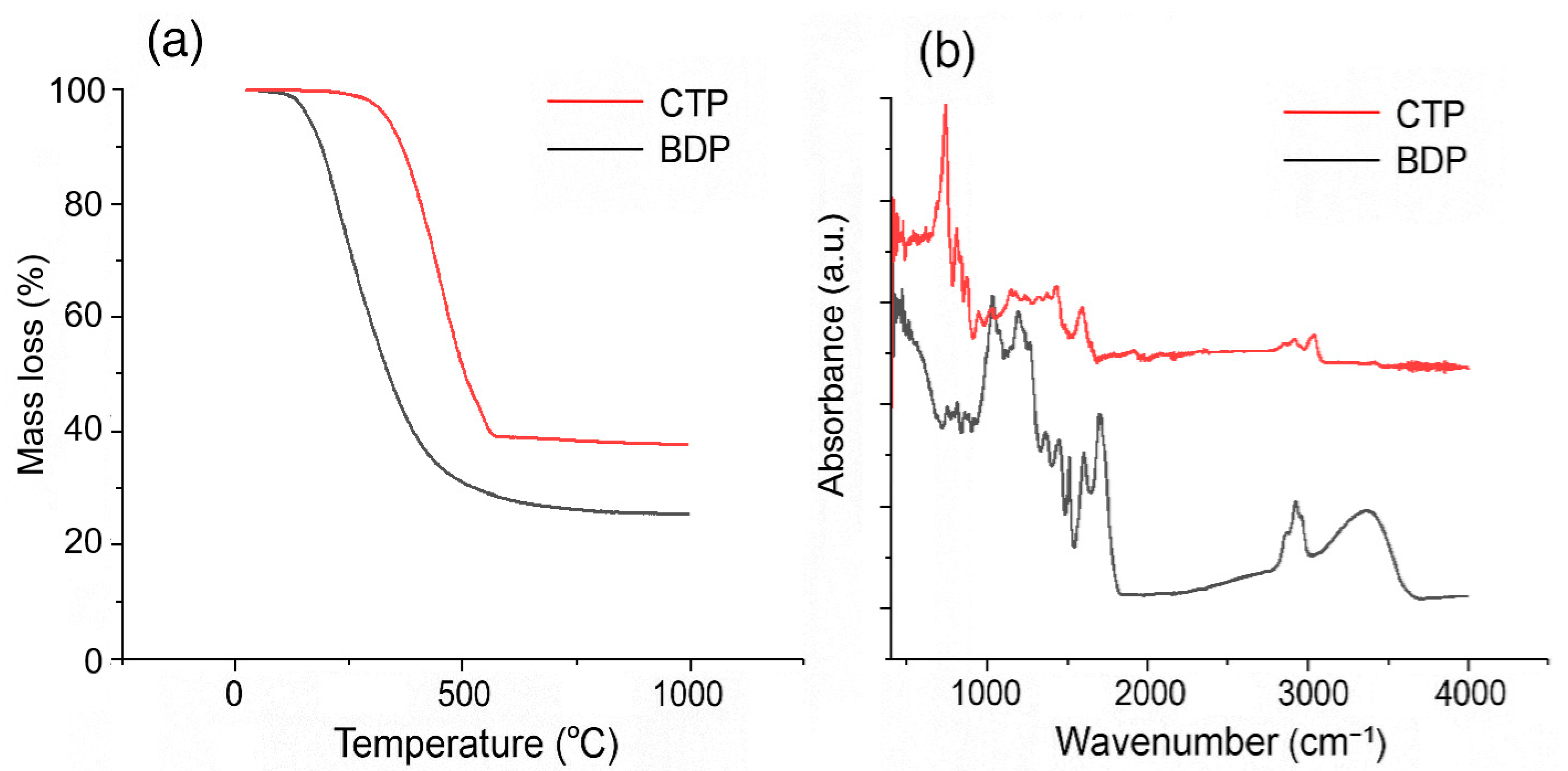 2.1. Chemical Composition and Surface Wettability Analysis of BDP and CTP