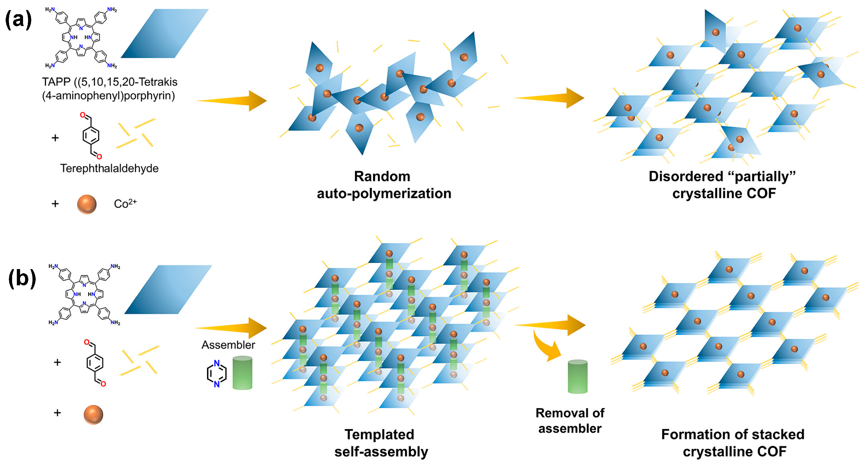 - Bourda, L.; Dansette, I.; Jena, H.S.; Chen, H.; Raza, A.; Vrielinck, H.; Van Hecke, K.; Van Der Voort, P.; Krishnaraj, C. Controlled synthesis of crystalline metalated porphyrin covalent organic frameworks through an assembler approach. Chem. Mater. 2024, 36, 9526–9534. [Google Scholar] [CrossRef]