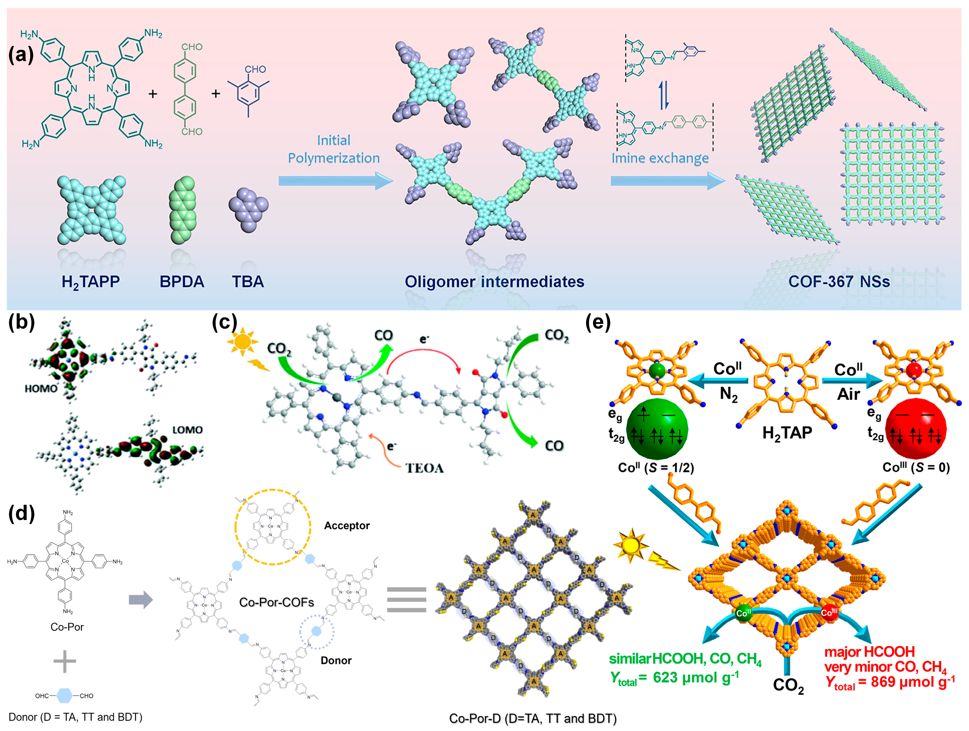 - Kim, Y.H.; Jeon, J.-P.; Kim, Y.; Noh, H.-J.; Seo, J.-M.; Kim, J.; Lee, G.; Baek, J.-B. Cobalt-porphyrin-based covalent organic frameworks with donor-acceptor units as photocatalysts for carbon dioxide reduction. Angew. Chem. Int. Ed. 2023, 62, e202307991. [Google Scholar] [CrossRef]