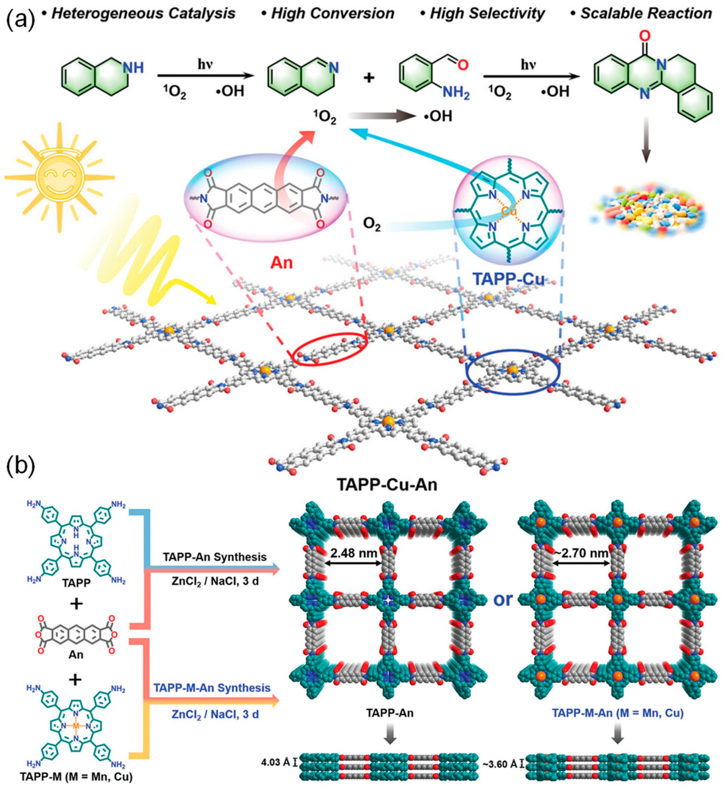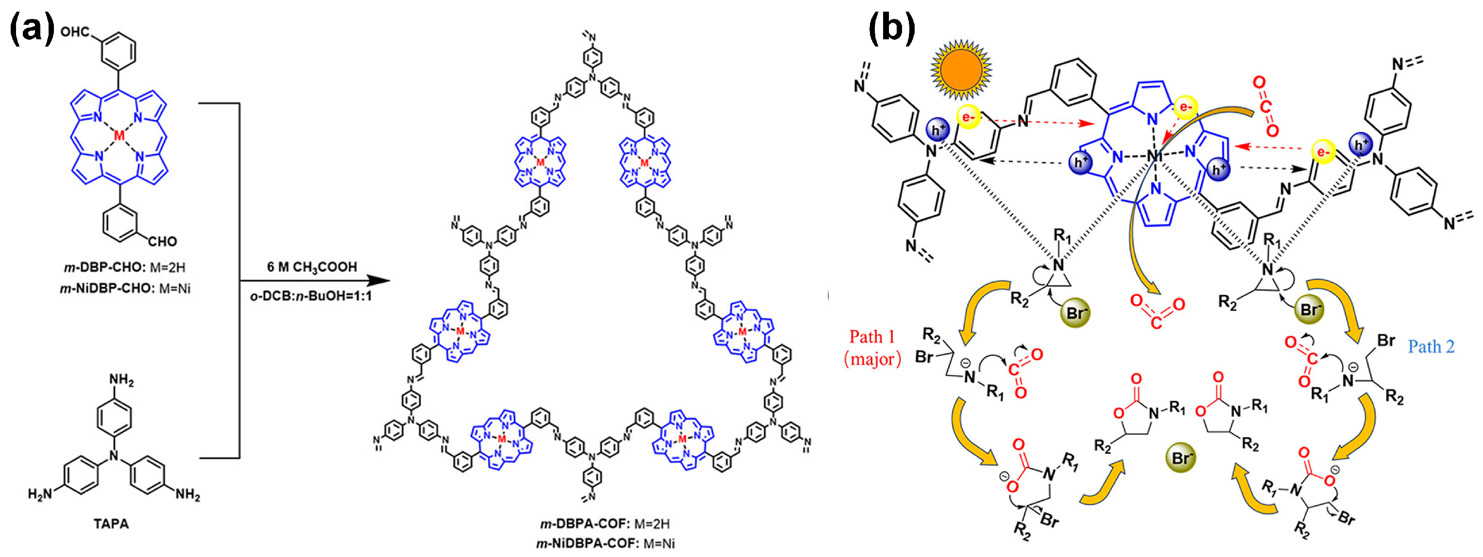 - Xiong, J.; Chen, M.H.; Xu, Y.H.; Feng, Y.Q.; Song, J.; Zhang, B. Trans-A2B2-type metalloporphyrin-based donor-acceptor covalent organic frameworks for efficient photocatalytic CO2 cycloaddition to aziridines. Adv. Sci. 2025, e13754. [Google Scholar] [CrossRef]