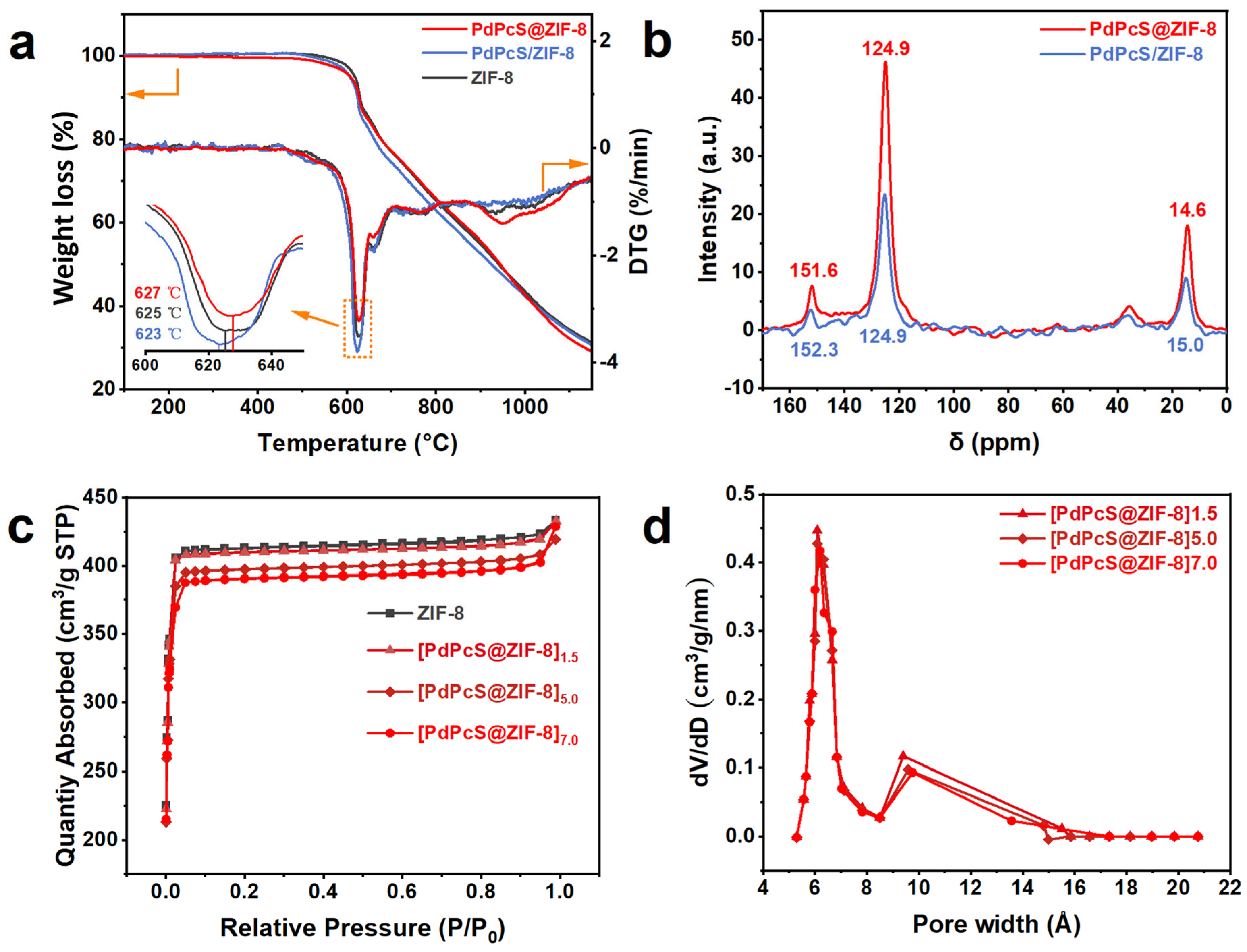 - Yin, H.; Kim, H.; Choi, J.; Yip, A.C.K. Thermal Stability of ZIF-8 Under Oxidative and Inert Environments: A Practical Perspective on Using ZIF-8 as a Catalyst Support. Chem. Eng. J. 2015, 278, 293−300. [Google Scholar] [CrossRef]