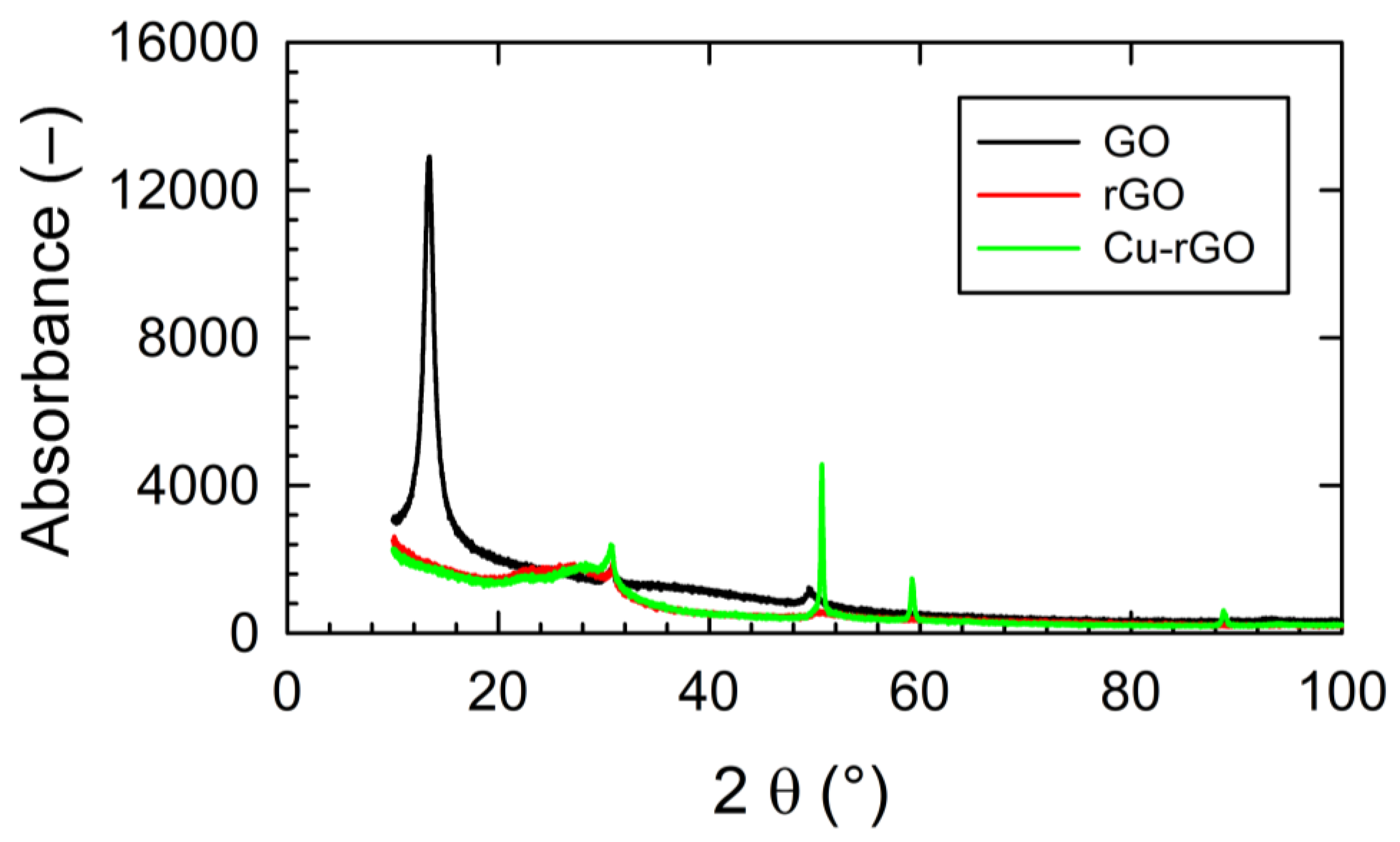 - Nasrollahzadeh, M.; Babaei, F.; Fakhri, P.; Jaleh, B. Synthesis, Characterization, Structural, Optical Properties and Catalytic Activity of Reduced Graphene Oxide/Copper Nanocomposites. RSC Adv. 2015, 5, 10782–10789. [Google Scholar] [CrossRef]