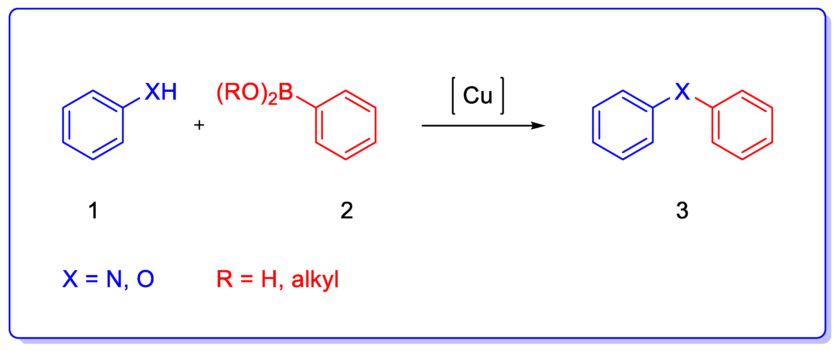 - West, M.J.; Fyfe, J.W.B.; Vantourout, J.C.; Watson, A.J.B. Mechanistic Development and Recent Applications of the Chan-Lam Amination. Chem. Rev. 2019, 119, 12491–12523. [Google Scholar] [CrossRef]