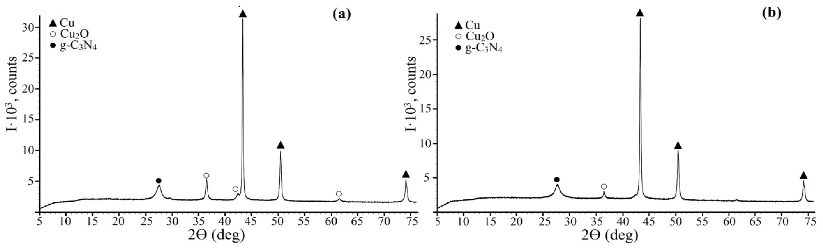 3.2. Synthesis of GO, g-C3N4, N-rGO, and Their Cu-Containing Composites