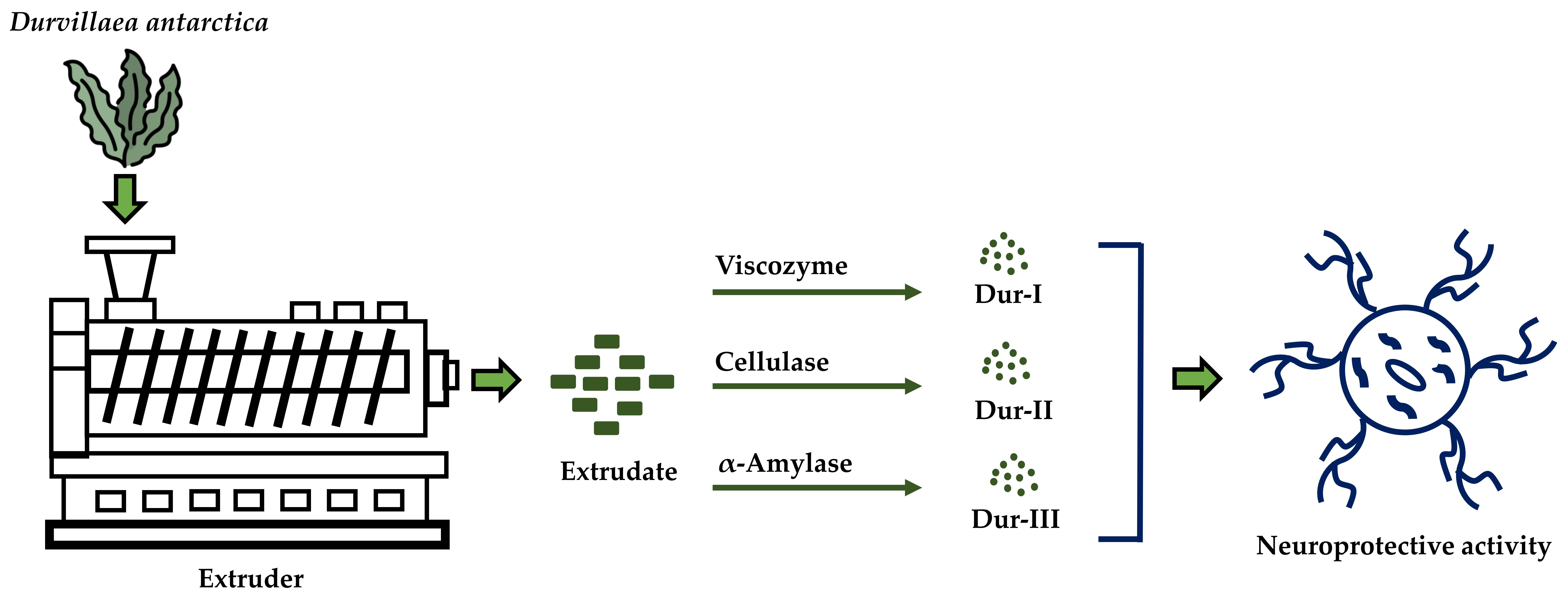 2.1. Preparation of Enzyme Extracts (Dur-I, Dur-II, and Dur-III) from Extrusion-Pretreated D. antarctica and Physicochemical Characteristics of Dur-I, Dur-II, and Dur-III