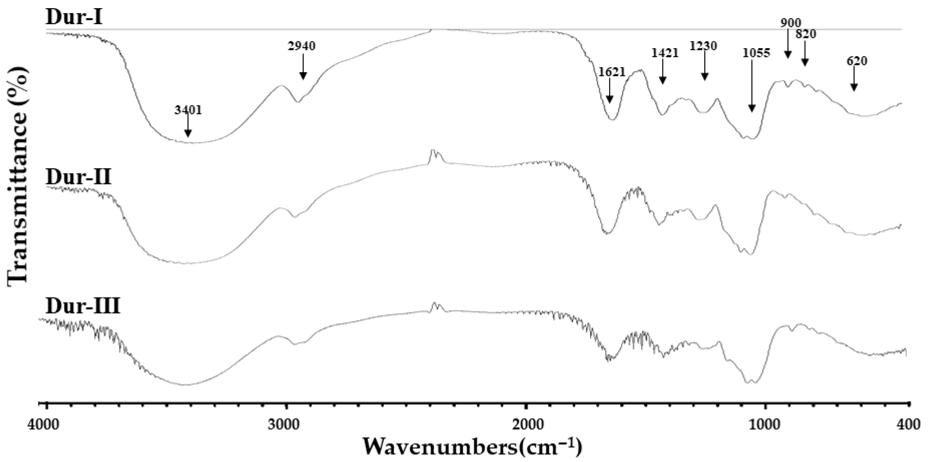 2.2. Elucidation of Structural Characterization of Dur-I, Dur-II, and Dur-III by FTIR and NMR Techniques