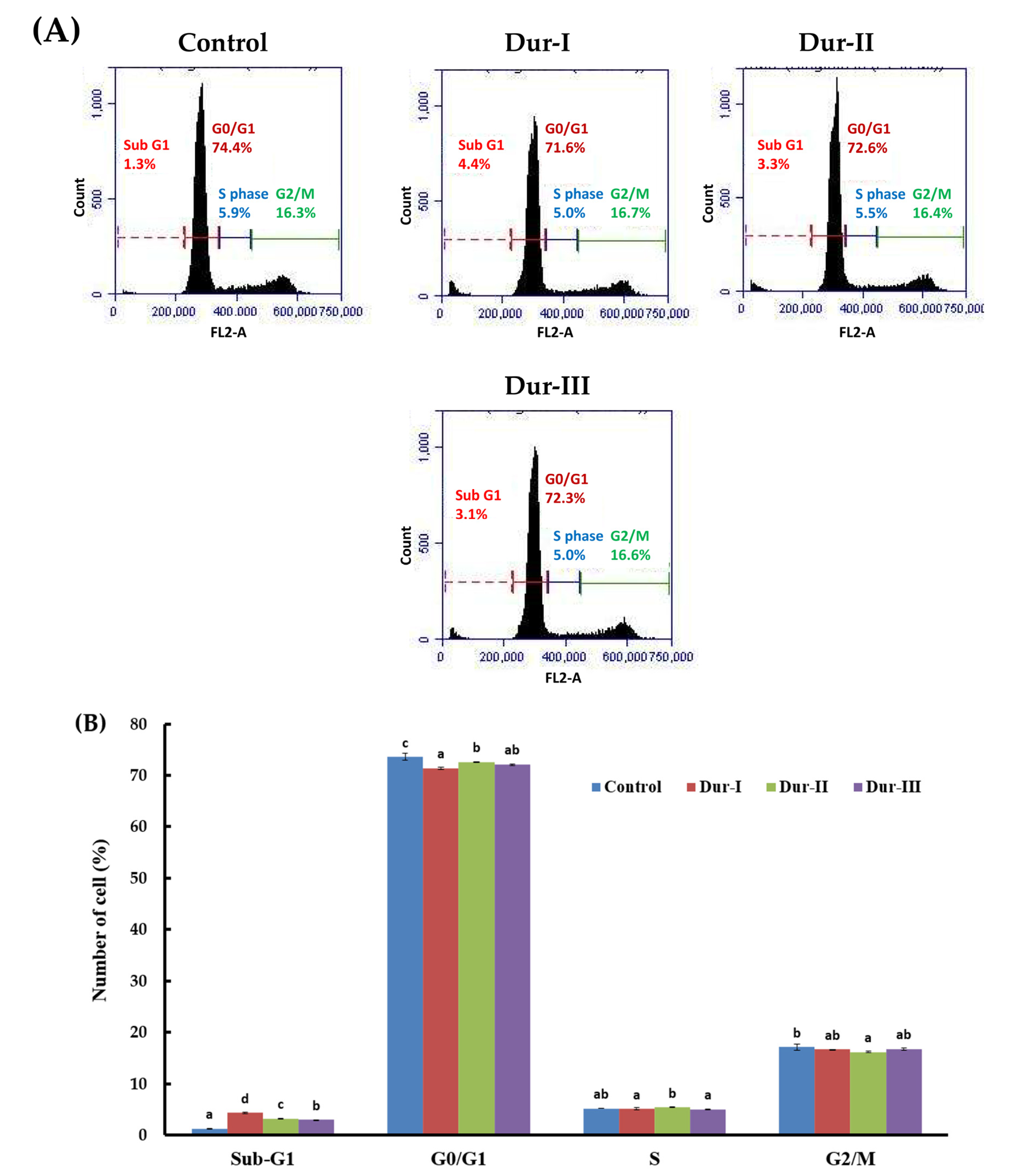 2.3. Dur-I, Dur-II, and Dur-III Attenuated Rotenone-Induced Apoptosis in SH-SY5Y Neuronal Cells