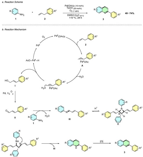 In 2017, Xu et al. reported a palladium-catalyzed oxidative cyclization of anilines 1 with allyl alcohols 4 for the synthesis of quinolines 3, operating without acids, bases, ligands, or additional additives under aerobic conditions (Scheme 2a) [7]. Using Pd(OAc)2 (10 mol%) in DMSO at 130 °C under O2 (1 atm) for 12 h, the protocol enabled the direct formation of 2-arylquinolines from cinnamyl alcohol derivatives and anilines.
