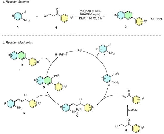 Yoon and Cheon (2019) introduced a novel Pd(II)-catalyzed cascade reaction enabling the regioselective synthesis of 2-arylquinolines 3 from 2-iodoanilines 5 and β-chloropropiophenones 6 (Scheme 3a) [8]. The optimized reaction conditions involve Pd(OAc)2 (5 mol%) as the catalyst, NaOAc (3.0 equiv.) as a base, and DMF as the solvent at 120 °C for 5 h.
