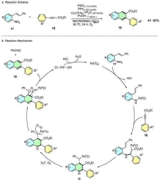 In 2016, Jiang et al. reported a palladium(II)-catalyzed intermolecular aerobic annulation of o-alkenylanilines 17 and alkynes 18, enabling the efficient synthesis of 2,3-disubstituted quinolines 19 (Scheme 10a) [15]. The reaction proceeds in the presence of PdCl2 (10 mol%), PPh3 (20 mol%), Cu(TFA)2·xH2O (20 mol%), and PivOH (1 equiv.) in a MeCN/DMSO (20:1) solvent system at 80 °C under an oxygen atmosphere.