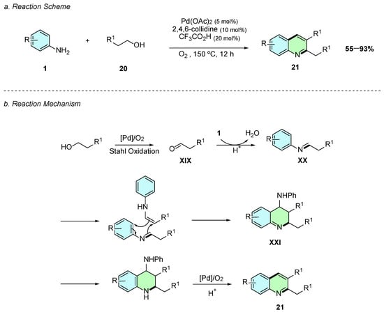 Regarding the reaction mechanism, Pd(OAc)2 firstly oxidizes the alcohol 20 to the corresponding aldehyde XIX via a Stahl-type oxidation (Scheme 11b). XIX then condenses with the aniline 1 to form an imine intermediate XX, which undergoes cycloaddition with its enamine tautomer to yield the intermediate XXI. Finally, rearomatization, elimination of an aniline molecule, and aerobic oxidation afford the desired 2,3-disubstituted quinoline 21.