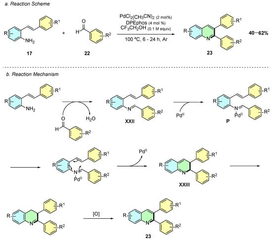 In 2020, Jang et al. developed a palladium(II)-catalyzed synthesis of 2,3-diaryl quinolines 23 from 2-alkenylanilines 17 and aldehydes 22 (Scheme 12a) [17]. The reaction conditions involved PdCl2(PhCN)2 (2 mol%) and DPEphos (4 mol%) in trifluoroethanol at 100 °C for 6–24 h under argon.