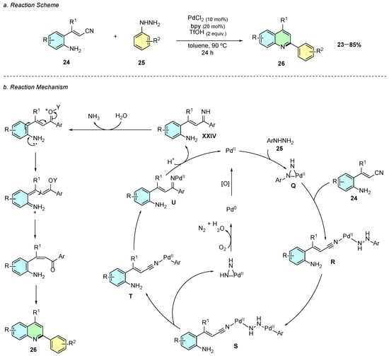 In 2020, Xie et al. reported a Pd(II)-catalyzed reaction of o-aminocinnamonitriles 24 with arylhydrazines 25, providing 2,4-disubstituted quinoline products 26 (Scheme 13a) [18]. The optimal conditions employed PdCl2 (5 mol%) as the catalyst, bpy (6 mol%) as the ligand, and triflic acid (2 equiv.) in toluene at 90 °C for 24 h.