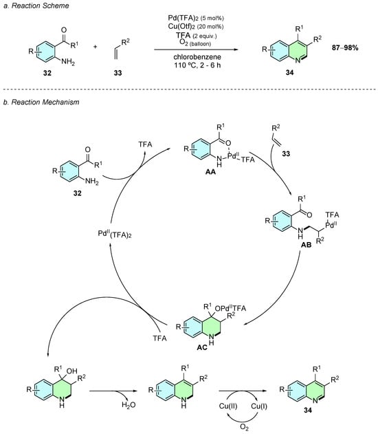 Mechanistically, the reaction first involves the coordination of the Pd(II) catalyst to 32 through both the nitrogen and oxygen lone electron pairs, together with the elimination of one of the TFA molecules, forming intermediate AA (Scheme 16b). A second coordination of the alkene 33 to the palladium center occurs, where the Pd−N bond acts as nucleophile attacking the alkene, forming the thermodynamic anti-Markovnikov 2-amino alkyl palladium intermediate AB. This intermediate undergoes intramolecular addition to the ketone, affording intermediate AC, which, upon protonation, loss of water, and oxidation by the copper(II) species, gives the desired 3,4-disubstituted quinoline 34.