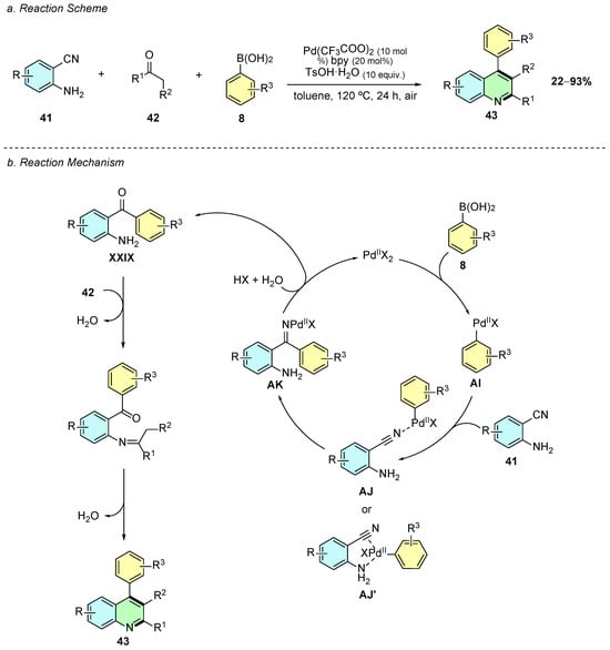 The reaction proceeds via an initial transmetallation between Pd(II) and the arylboronic acid 8, generating the aryl-palladium species AI, which then coordinates with the nitrile functionality (intermediate AJ/AJ’) (Scheme 19b). The subsequent carbopalladation of the cyano group forms the imine-palladium intermediate AK that, upon hydrolysis, generates the aminoketone XXIX, which undergoes a Friedländer-type cyclization to yield the quinoline 43.