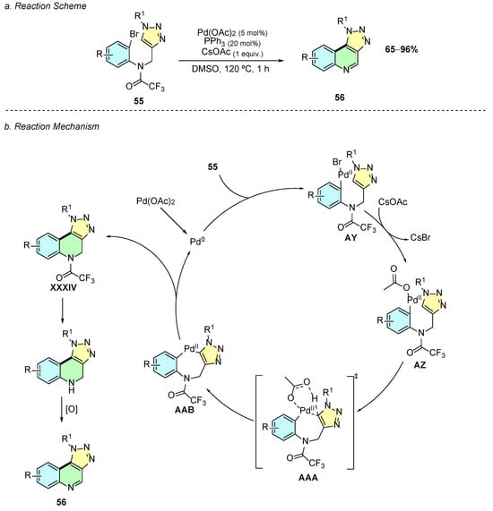 In 2025, Ullah et al. developed a Pd(II)-catalyzed methodology for the synthesis of [1,2,3]triazolo [4,5-c]quinoline derivatives 56 from N-((1-substituted-1H-1,2,3-triazol-4-yl)methyl)-N-(2-bromophenyl)-2,2,2-trifluoroacetamides 55 (Scheme 24a) [30]. The optimized reaction conditions employed Pd(OAc)2 (5 mol%), PPh3 (20 mol%), and CsOAc (1 equiv.) in DMSO at 120 °C for 1 h.