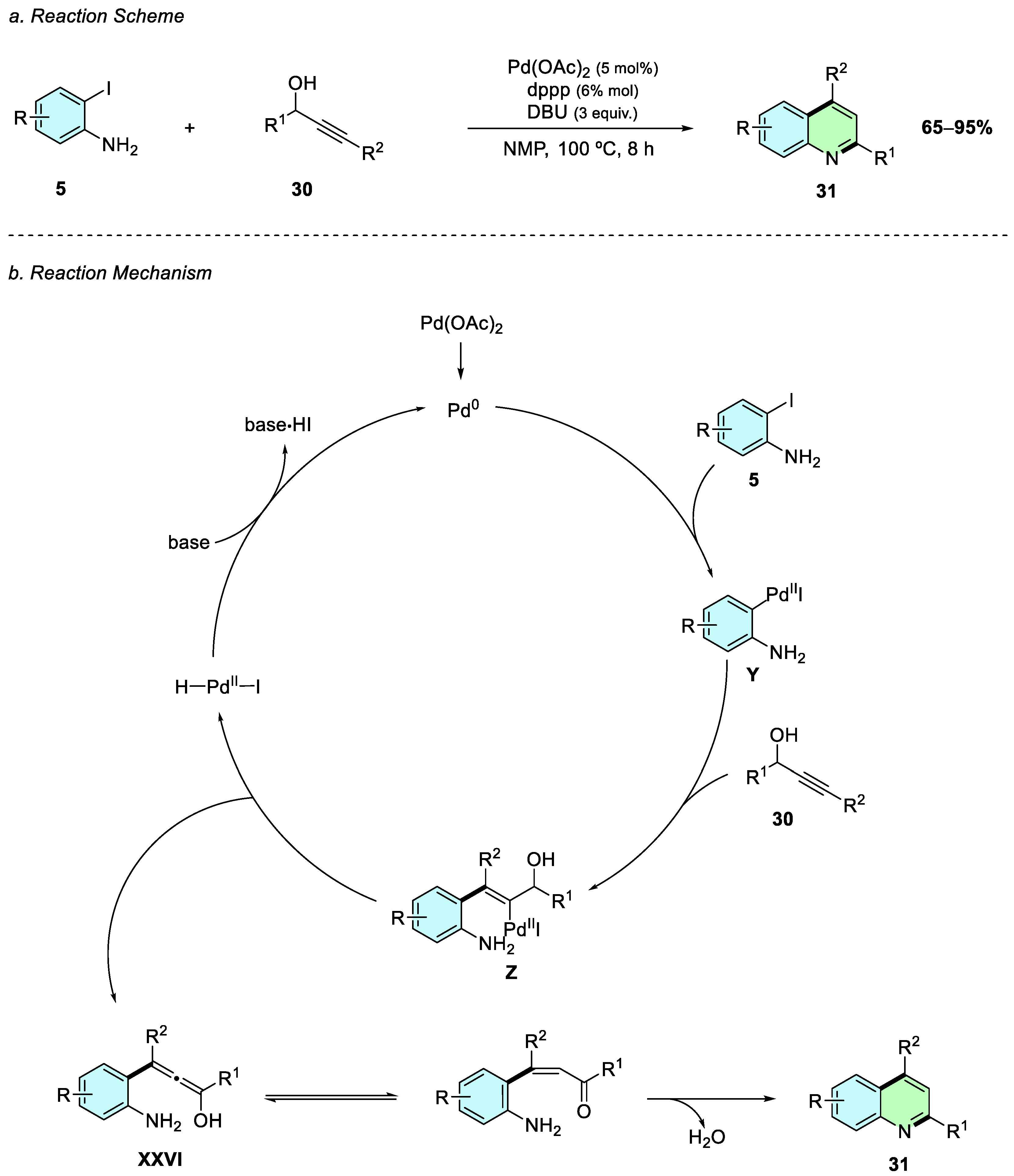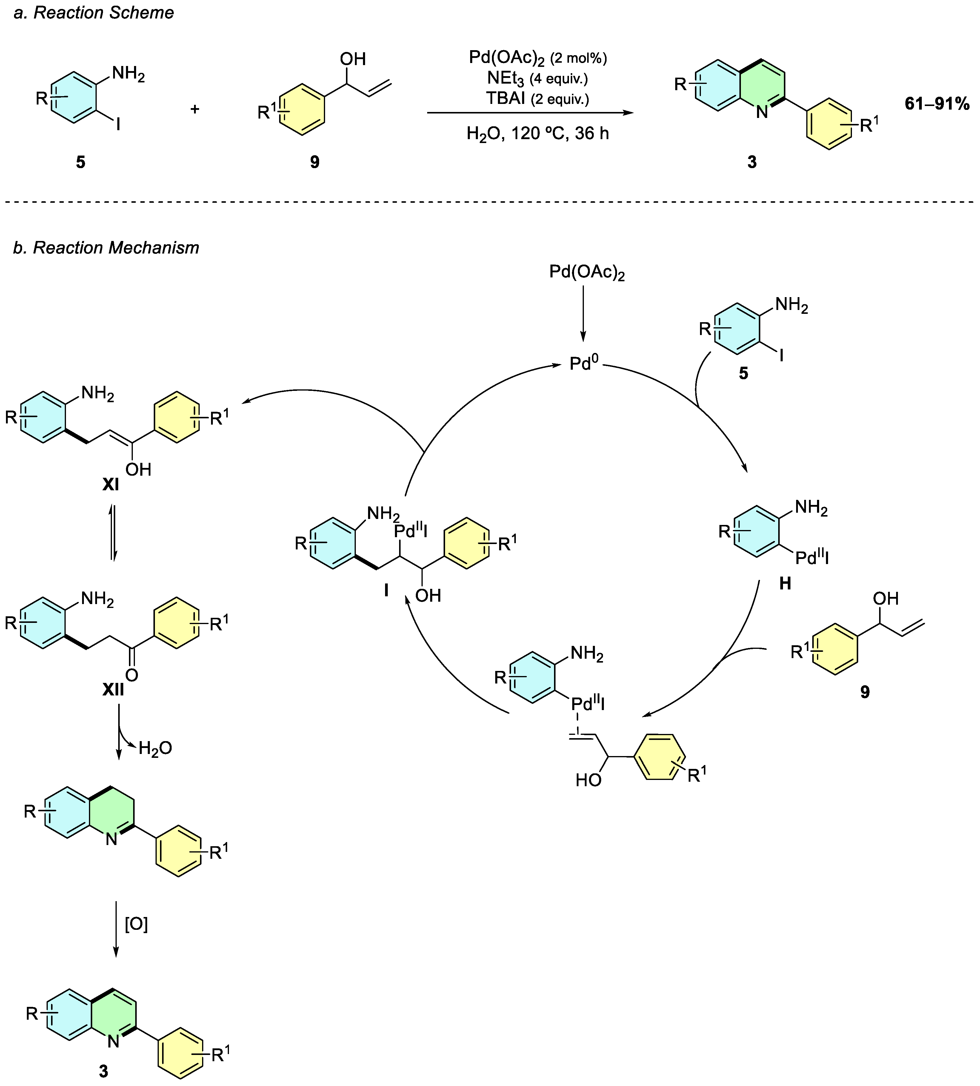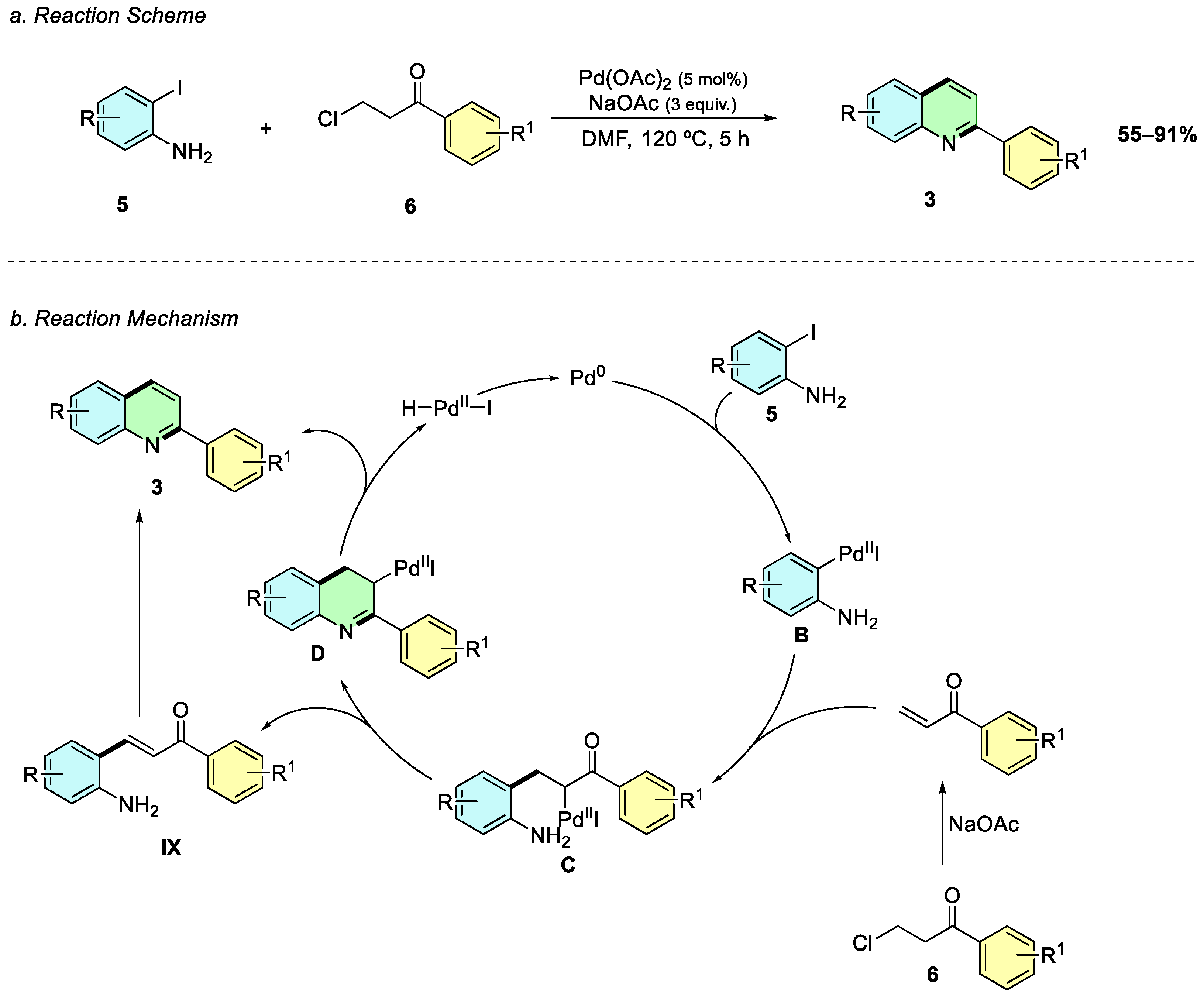 IX, which undergoes palladium-catalyzed dehydrative cyclization to afford the quinoline product