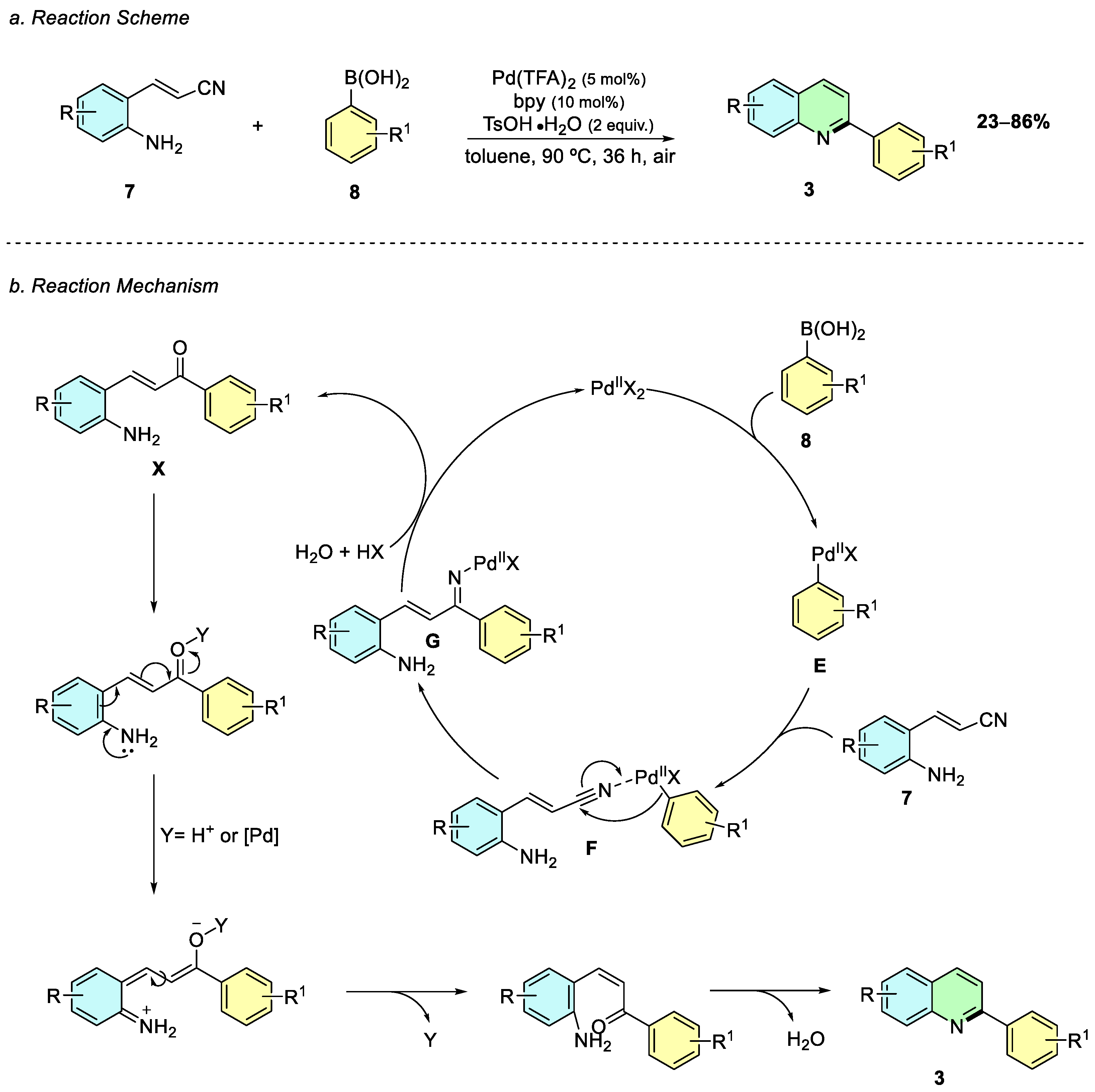 Yoon and Cheon (2019) introduced a novel Pd(II)-catalyzed cascade reaction enabling the regioselective synthesis of 2-arylquinolines