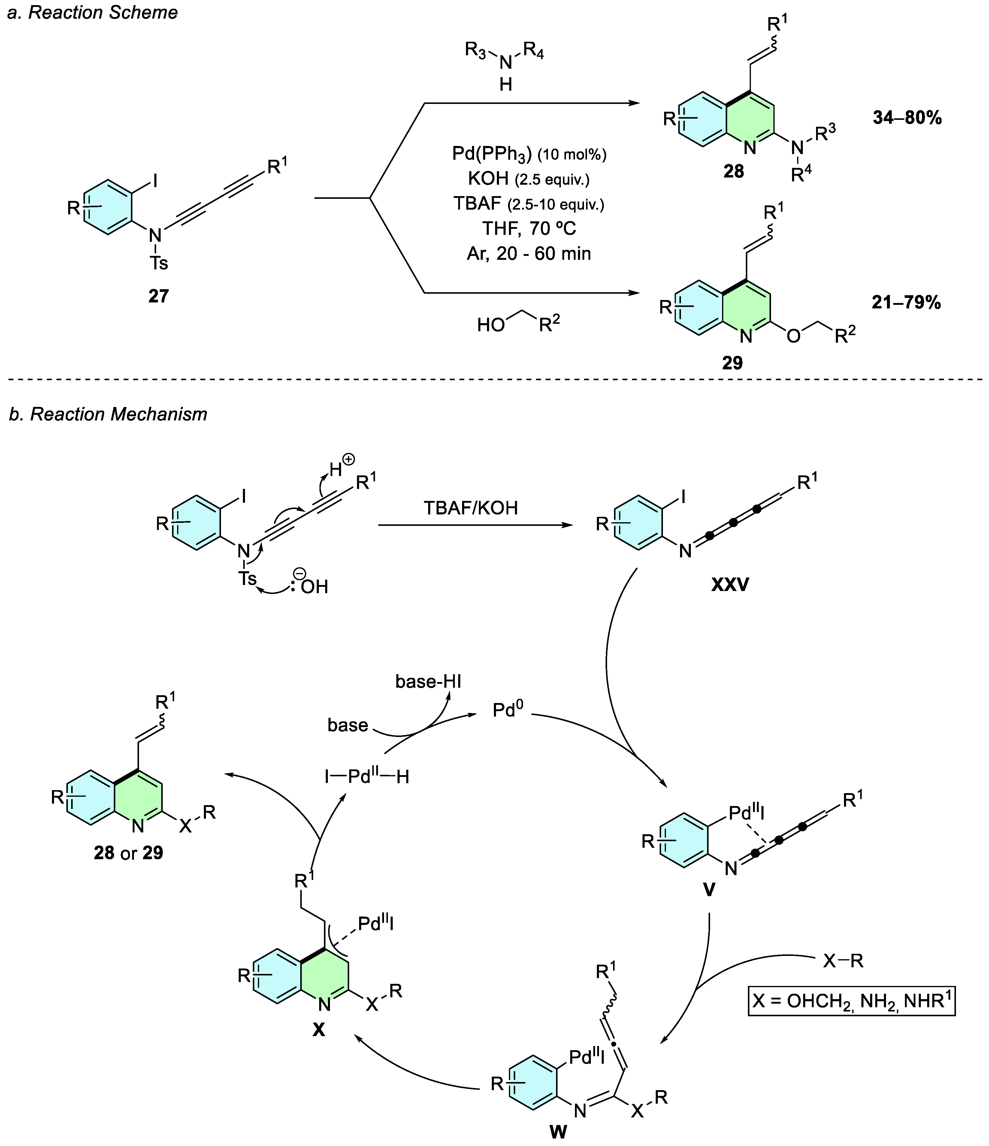 o-haloanilines and imines to heterocycle-containing substrates, while the coupling partners include internal alkynes and aryl isocyanides, or are generated intramolecularly without the need for an external coupling component. Reaction efficiencies span a broad range (27–96%), reflecting the increased steric and electronic demands associated with the formation of annulated frameworks. Notably, systems employing well-chosen bases or additives, such as CsOAc, KOAc, or TBAI, tend to afford higher and more reproducible yields. Overall, these examples highlight the versatility of palladium catalysis in assembling complex annulated quinoline architectures that would be challenging to access using more conventional synthetic approaches.