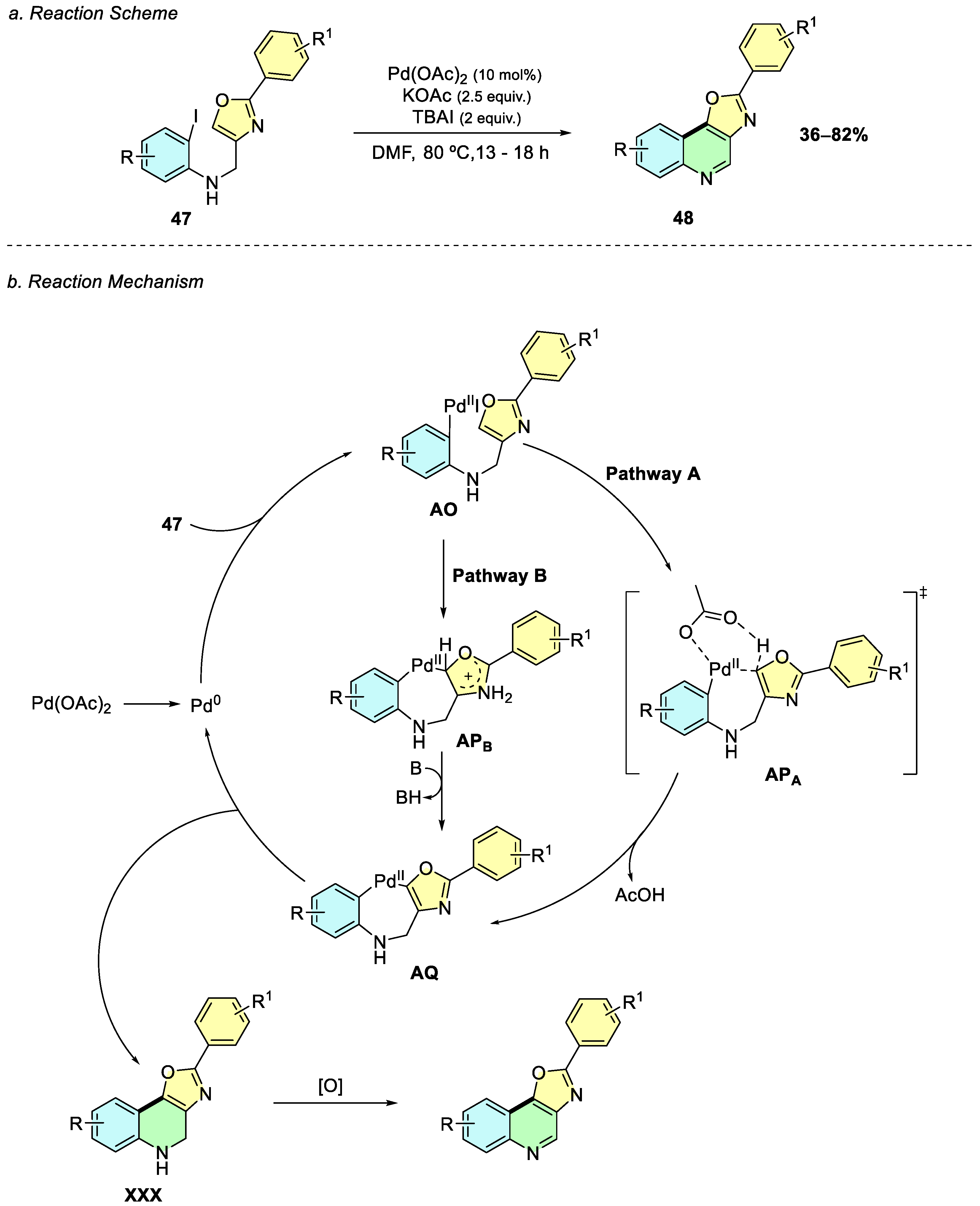 AQ. Alternatively, in pathway B, an electrophilic palladation via electrophilic aromatic substitution (EAS) process on the oxazole ring forms intermediate