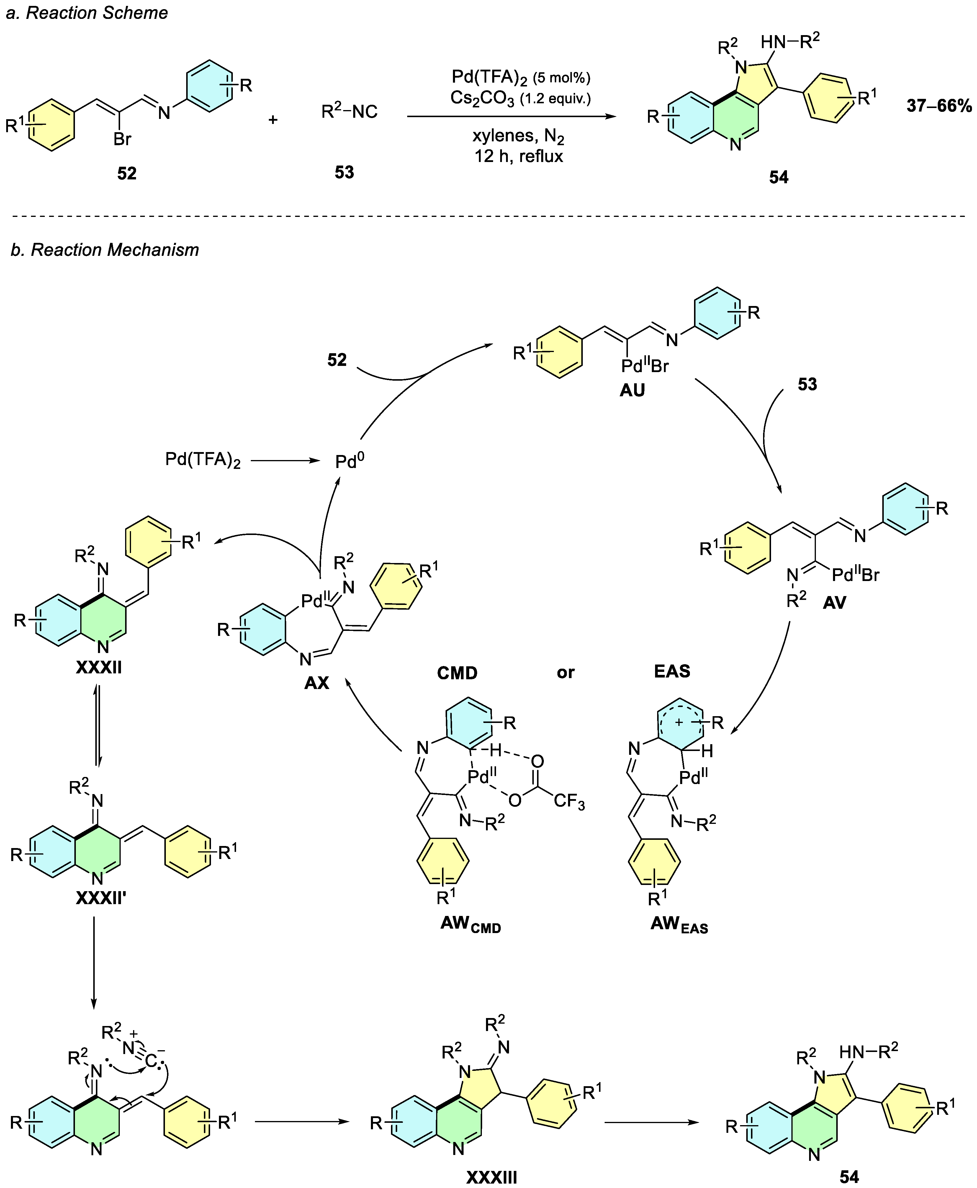 Scheme 23b). This species undergoes a carbopalladation step with the aryl isocyanide