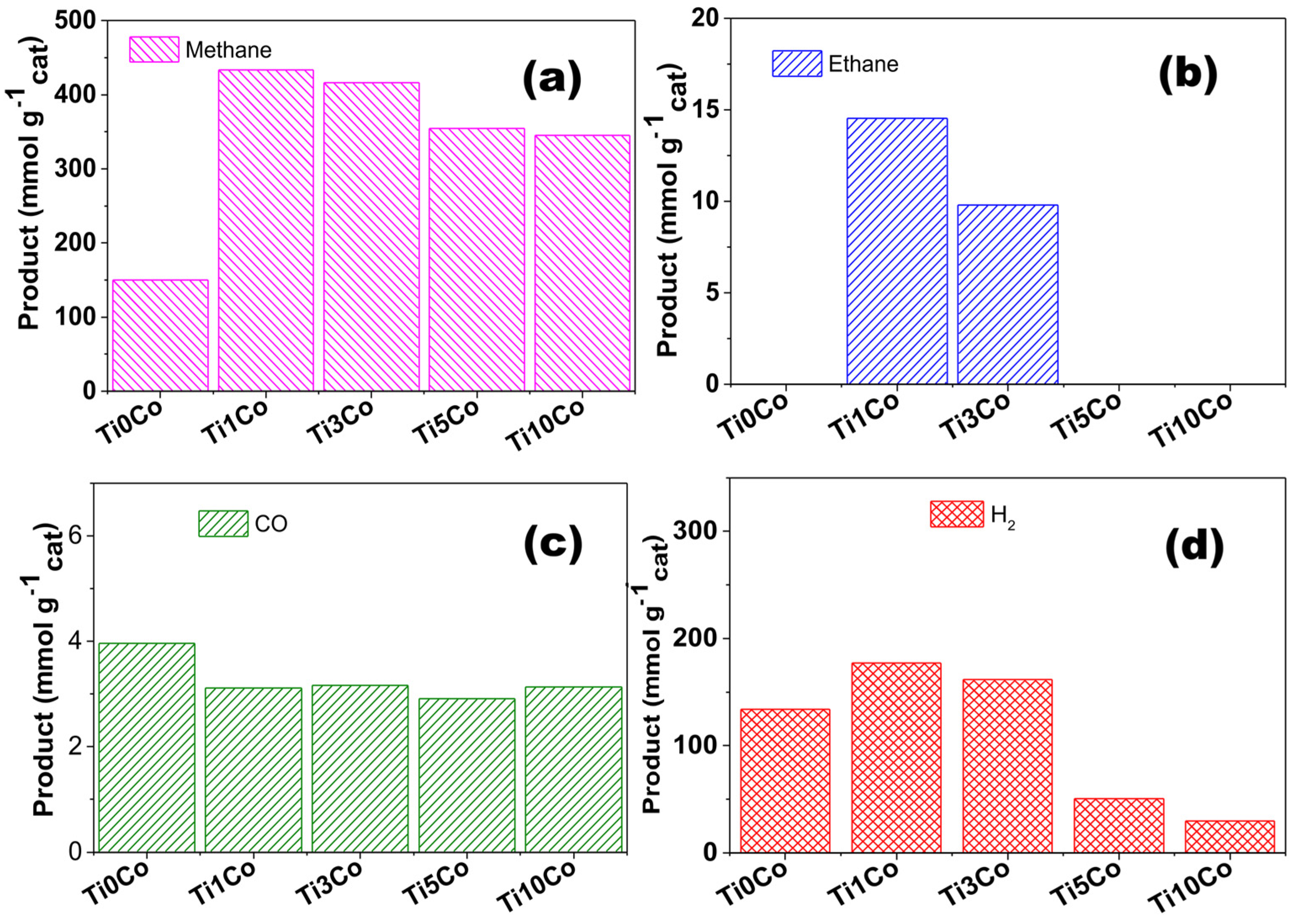 | Sample | Methane (mmol g−1cat) | Ethane (mmol g−1cat) | CO (mmol g−1cat) | H2 (mmol g−1cat) |