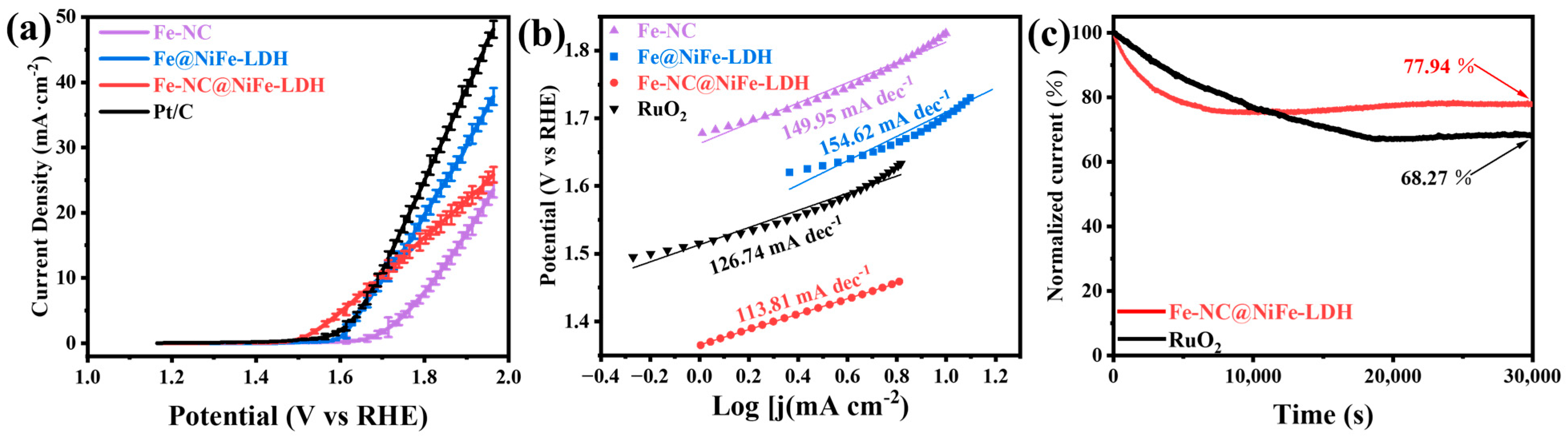 APA StyleSha, P., Ling, Z., Liu, K., Chen, D., Pang, B., Yan, F., Sui, J., Zhang, Q., Yu, J., Yu, L., & Dong, L. (2026). Fe-NC@NiFe-LDH Derived from Iron-Based Metal–Organic Frameworks as an Efficient Bifunctional Oxygen Electrocatalyst for Zn–Air Batteries. Catalysts, 16(2), 152. https://doi.org/10.3390/catal16020152