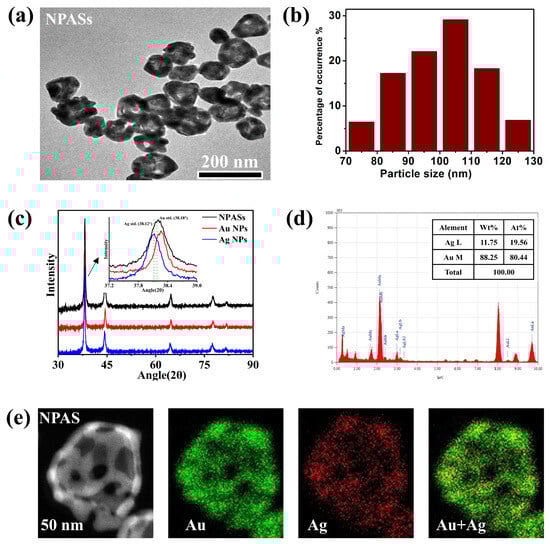 Figure 1c presents the XRD patterns of NPASs, Au NPs, and Ag NPs; all three exhibit characteristic diffraction peaks typical of fcc structures. The inset magnified the (111) peak, with dashed lines indicating the standard positions of the fcc Ag (38.12°, JCPDS 04-0783) and fcc Au (38.18°, JCPDS 04-0784) (111) reflections. The (111) peak of the NPASs was shifted relative to those of the pure phases and lies between the Au and Ag peaks. This indicates that its lattice parameter lay between the two, suggesting Au–Ag alloying/solid-solution formation (consistent with Vegard’s law) [17].