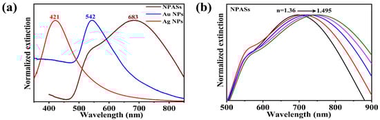 (a) Normalized UV–vis extinction spectra of NPASs, Ag NPs and Au NPs in aqueous media for comparison of spectral profiles and peak positions; the corresponding non-normalized (raw) extinction/absorbance spectra are provided in Supplementary Figure S1 for quantitative reference. (b) Evolution of NPAS extinction spectra in solvents with varying refractive indices (n = 1.36–1.495).